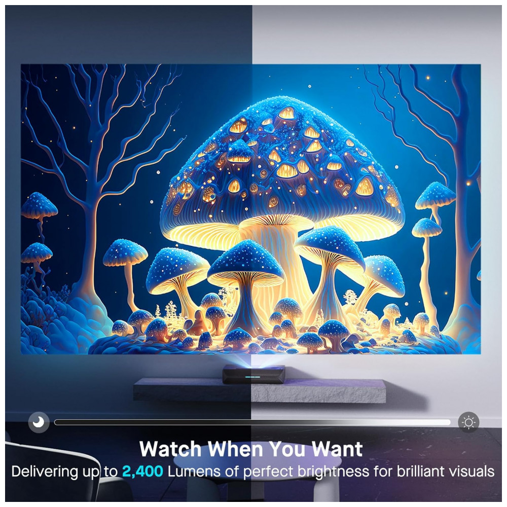 O projetor Aurora Pro utiliza tecnologia a laser tri cor baseada em ALPD 4 0, projetando imagem em resolução de 3840 x 2160 pixels em formato 16 9, com brilho em torno de 2400 lumens e contraste nativo próximo de 3000 1, complementado por escurecimento dinâmico do laser para ampliar o contraste efetivo. Ele suporta padrões HDR como HDR10, HLG e Dolby Vision e aceita sinais em até 4K a 120 Hz, com modo de baixa latência adequado para jogos, além de integrar sistema de som de 60 W com suporte a Dolby Atmos para uso em salas de médio porte.