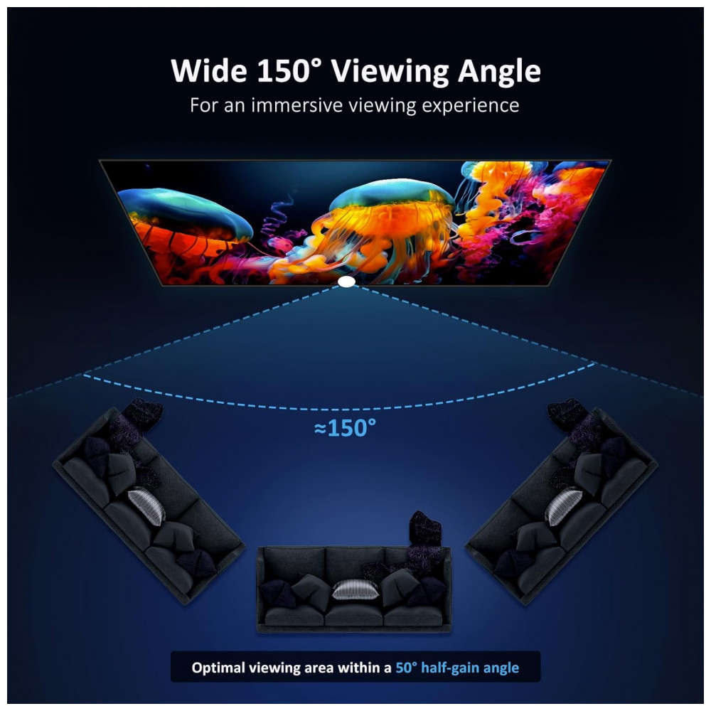 Características da tela: Tela ALR Fresnel de 100 polegadas ganho em torno de 1,5 rejeição de luz ambiente de cerca de 85 por cento ângulo de visão amplo compatível com resolução até 8K e conteúdos 3D