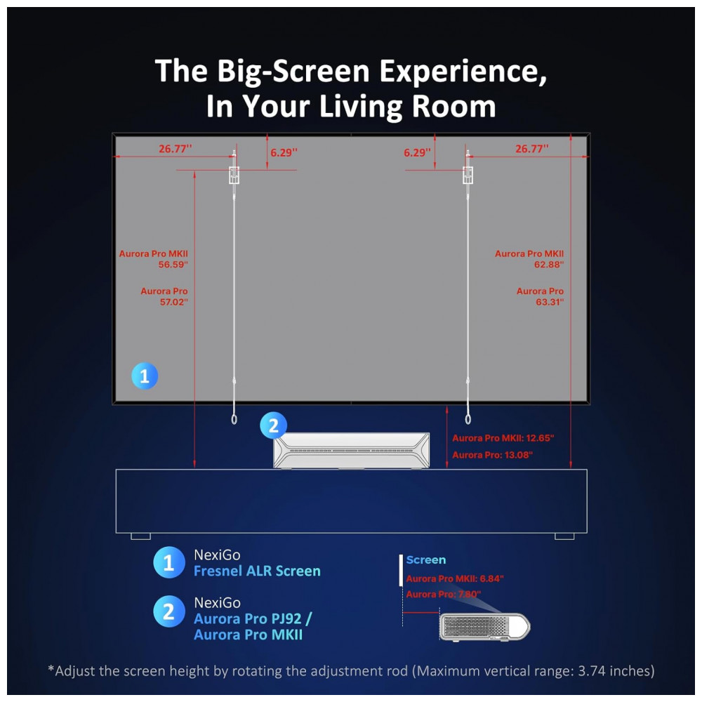 Este conjunto NexiGo integra o projetor a laser 4K de tiro ultra curto Aurora Pro, uma tela ALR Fresnel de 100 polegadas e um par de óculos 3D ativo com tecnologia DLP Link, formando um sistema completo de home theater para ambientes residenciais. A solução é indicada para salas com luminosidade variável, combinando projeção de curta distância, tela com rejeição de luz ambiente e suporte a 3D ativo para conteúdos compatíveis.