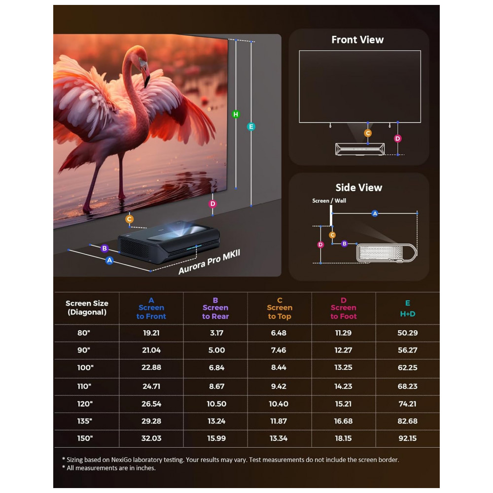 O NexiGo Aurora Pro MKII é um projetor a laser 4K tri‑color de ultra curta distância projetado para home theater e jogos, oferecendo alta definição de imagem em telas de até 150″ a partir de curta distância da parede. O motor de luz a laser ALPD 5.0 fornece brilho de 2.400 lúmens, gama de cores de 107% BT.2020 e acurácia de cor em torno de ΔE≈1, com vida útil estimada em até 30.000 horas de uso.