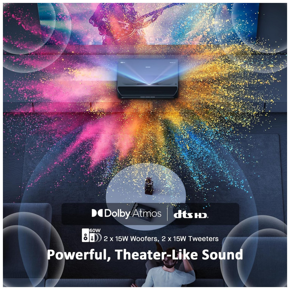 O sistema de áudio integrado conta com 60 W de potência em configuração estéreo, com dois woofers de 15 W e dois tweeters de 15 W, além de suporte a Dolby Atmos para som surround por meio de conexões compatíveis com eARC. A construção de ultra curta distância (UST) com relação de projeção aproximada de 0,233:1 permite instalação próxima à parede ou tela, tornando o equipamento adequado para salas com espaço limitado e uso conjunto com telas ALR recomendadas pelo fabricante.