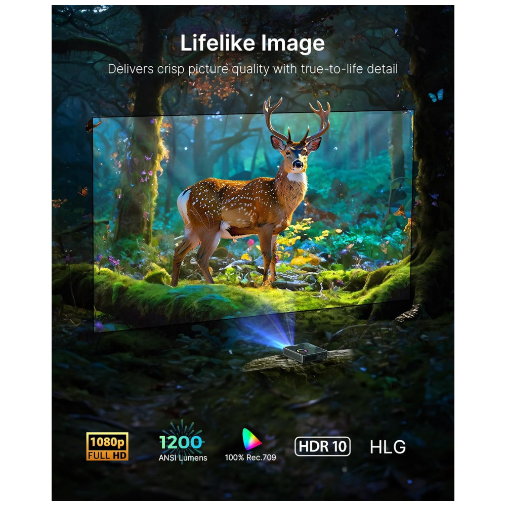 O projetor a laser portátil NexiGo Nova Mini com óculos 3D DLP-Link foi desenvolvido para uso doméstico e portátil, oferecendo projeção em resolução Full HD 1080p com brilho de 1200 lumens e contraste superior a 15.000:1. A combinação de tecnologia DLP com fonte de luz a laser permite projeção em telas de 60 a 150 polegadas no formato 16:9, com ampla cobertura de cores e compatibilidade com conteúdos HDR10 e HLG, adequada para ambientes internos com luminosidade controlada.