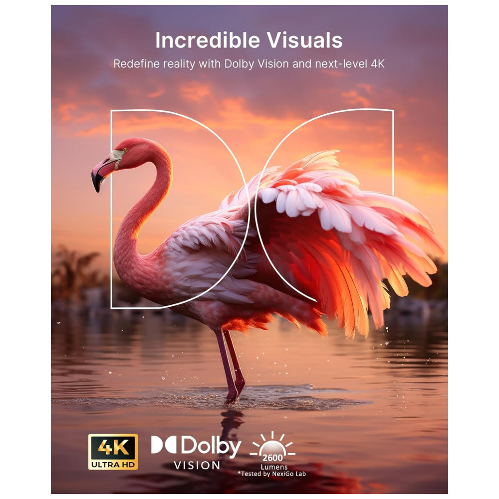 O NexiGo TriVision Ultra é um projetor 4K de longo alcance com fonte de luz híbrida Tri LED Laser, indicado para uso portátil em home theater, jogos e entretenimento em ambientes internos, oferecendo imagem de até 300 polegadas com alta saturação de cores e sem speckle de laser. Ele entrega brilho em torno de 2600 lumens, cobre cerca de 110 por cento do espaço de cor BT 2020 com precisão de cor próxima a delta E menor que 1 e suporta Dolby Vision, HDR10 plus e HLG para melhor contraste e detalhes em conteúdos de alta faixa dinâmica.