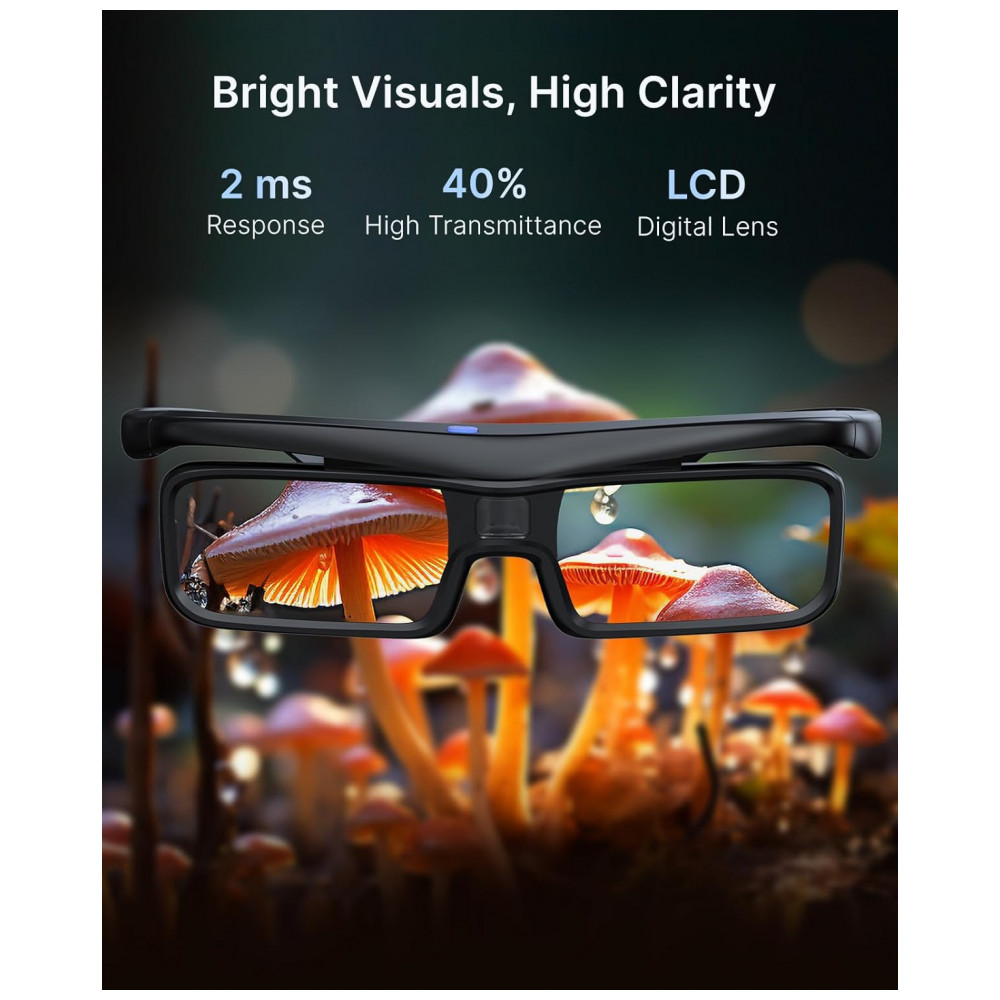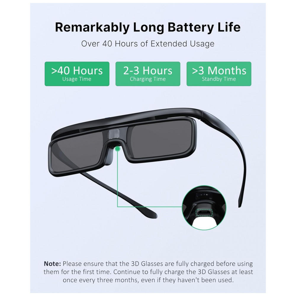 O conjunto inclui ainda um par de óculos 3D ativo DLP Link recarregáveis, compatíveis com o modo 3D do TriVision Ultra e de outros projetores DLP equivalentes, com taxa de atualização de até 144 Hz, bateria com mais de 40 horas de autonomia por carga e função de inversão esquerda direita pelo botão de energia. Esses óculos foram projetados para reduzir ghosting e cintilação em conteúdos 3D, proporcionando experiência mais confortável em sessões prolongadas.