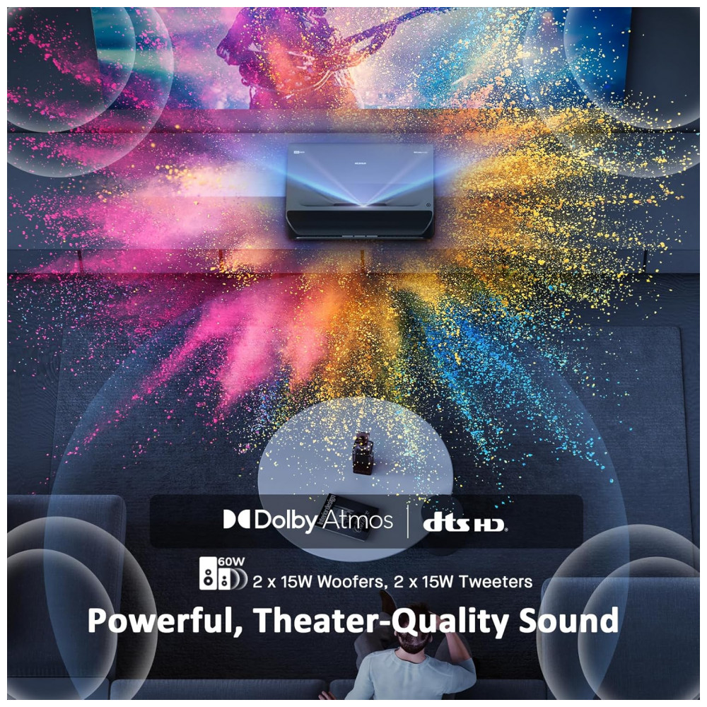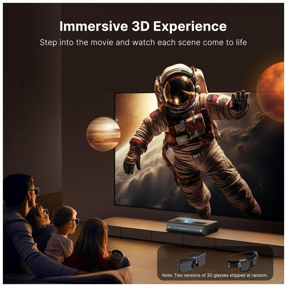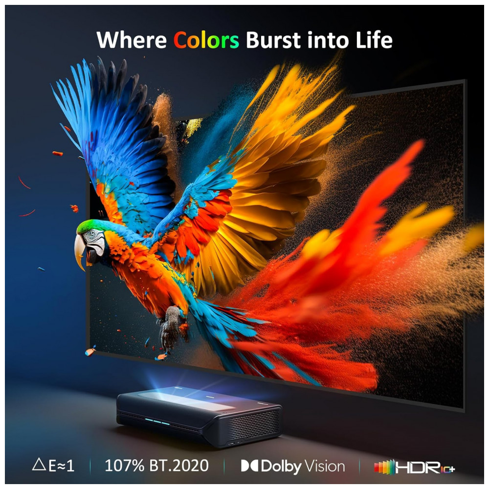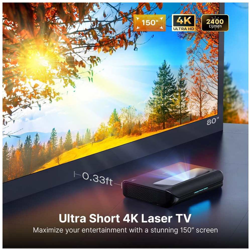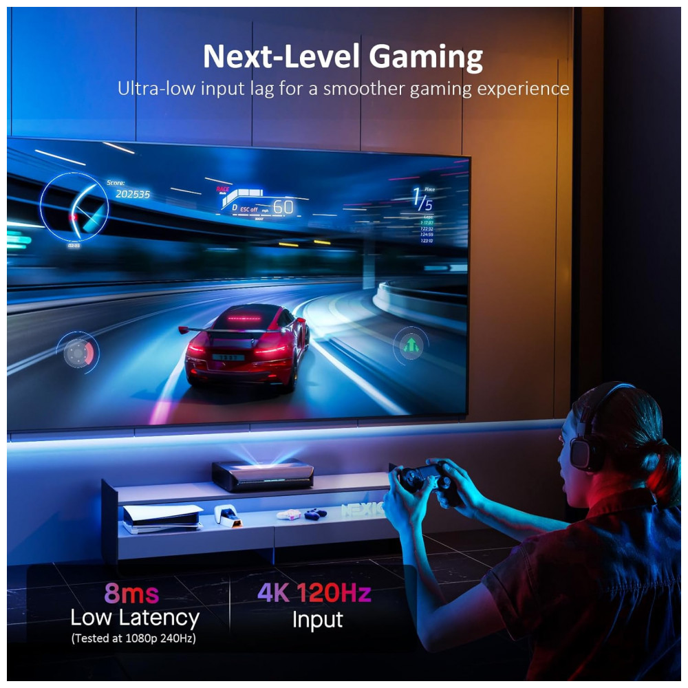 O projetor a laser ultracurto NexiGo Aurora Pro com óculos 3D é um UST Laser TV 4K baseado em tecnologia DLP com fonte de luz tri‑laser RGB+ ALPD 4.
