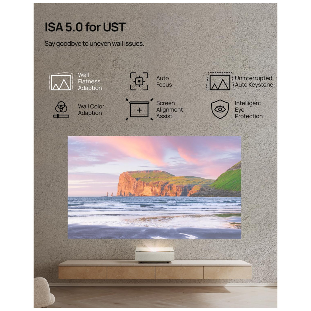 Com relação de projeção de 0,177:1, o equipamento consegue gerar imagens de aproximadamente 80 a 150 polegadas equivalentes, permitindo instalação próxima à parede ou tela, ideal para racks e móveis de sala. O conjunto de recursos ISA 5.0 inclui foco automático, correção automática de keystone, alinhamento de tela e compensações de imagem, reduzindo o tempo de configuração e garantindo enquadramento adequado.