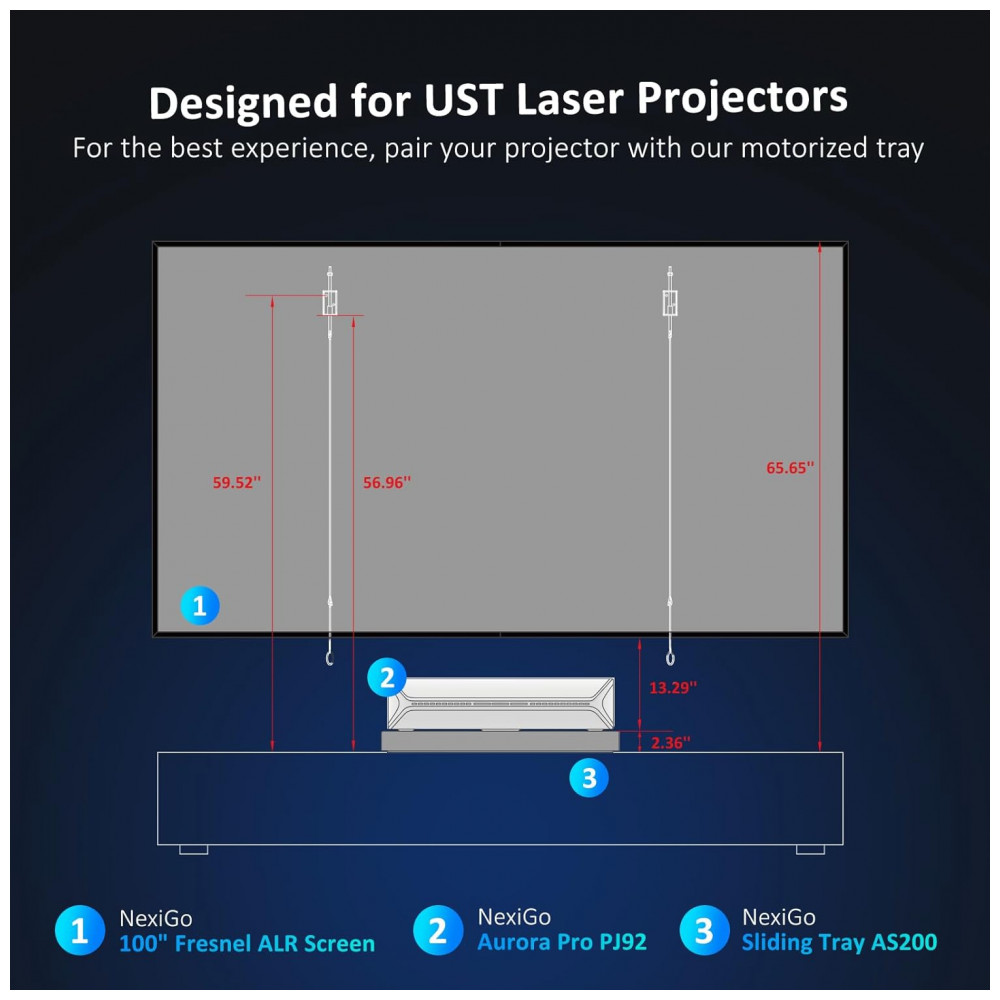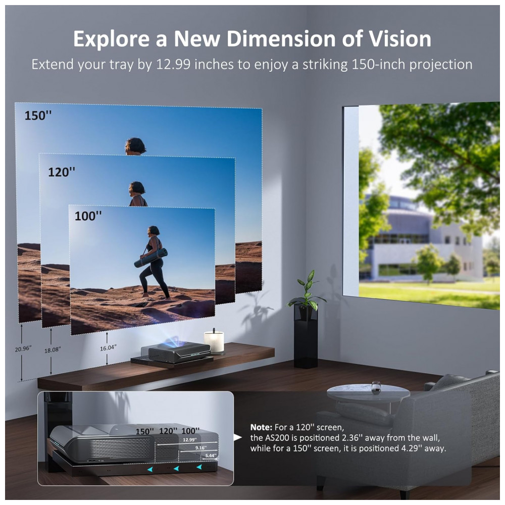A bandeja deslizante motorizada NexiGo AS200 foi desenvolvida para uso com projetores de ultra curta distância (UST), permitindo ajustar a distância do projetor em relação à parede para obter imagens de até 150 polegadas sem reposicionamento manual constante. O sistema telescópico motorizado desloca a base para trás em até 32,99 cm, oferecendo flexibilidade de enquadramento em diferentes tamanhos de tela.