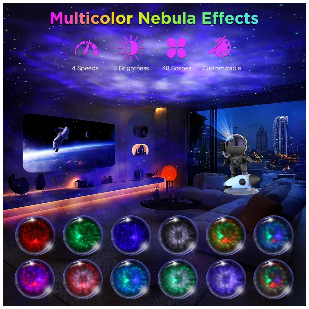 O Projetor de Galáxia Astronauta 4 em 1 combina um projetor, luz noturna, máquina de ruídos brancos e alto-falante Bluetooth em um único dispositivo. Com formato de foguete e 9 cores, ele combina 10 efeitos deslumbrantes de nebulosas com estrelas verdes cintilantes. Controle o fluxo e brilho em 4 níveis via controle remoto ou aplicativo, criando uma atmosfera serena e relaxante perfeita para noites de filmes, encontros românticos, jogos e decoração. Seu design flexível permite projetar a galáxia em diversas superfícies, enquanto o alto-falante Bluetooth 5.1 proporciona qualidade sonora de alta definição. A máquina de ruídos brancos com 15 opções ajuda na melhoria do sono e relaxamento. Um presente ideal para a decoração de quartos.