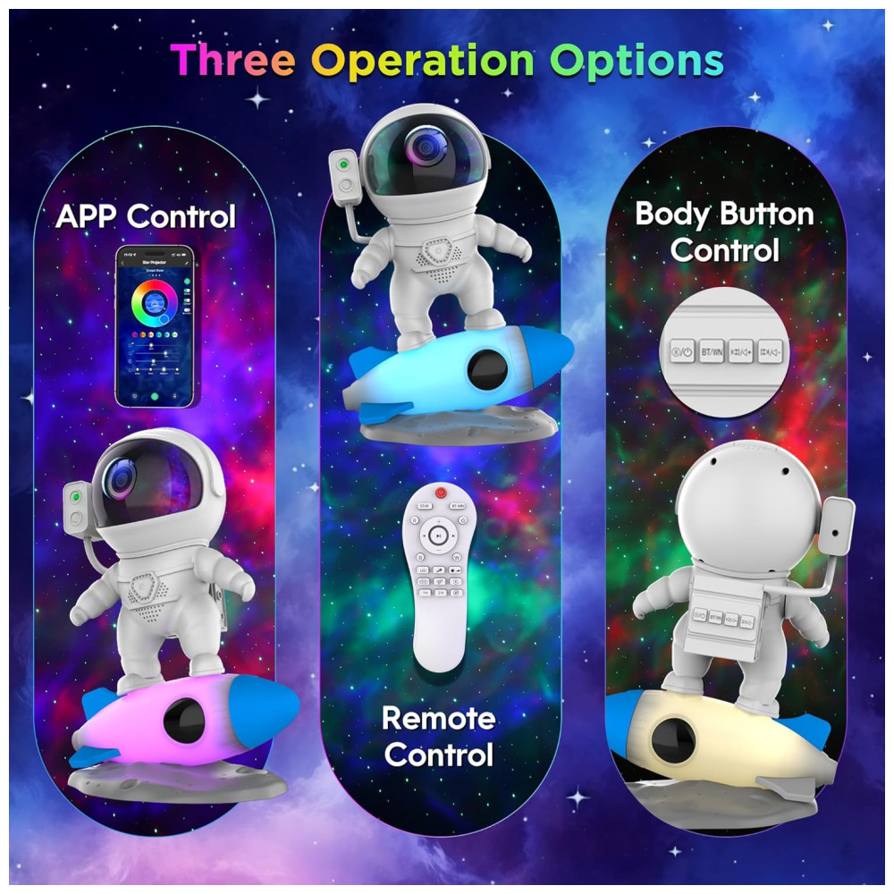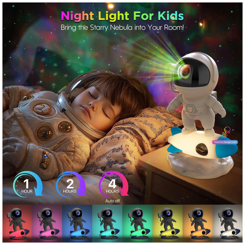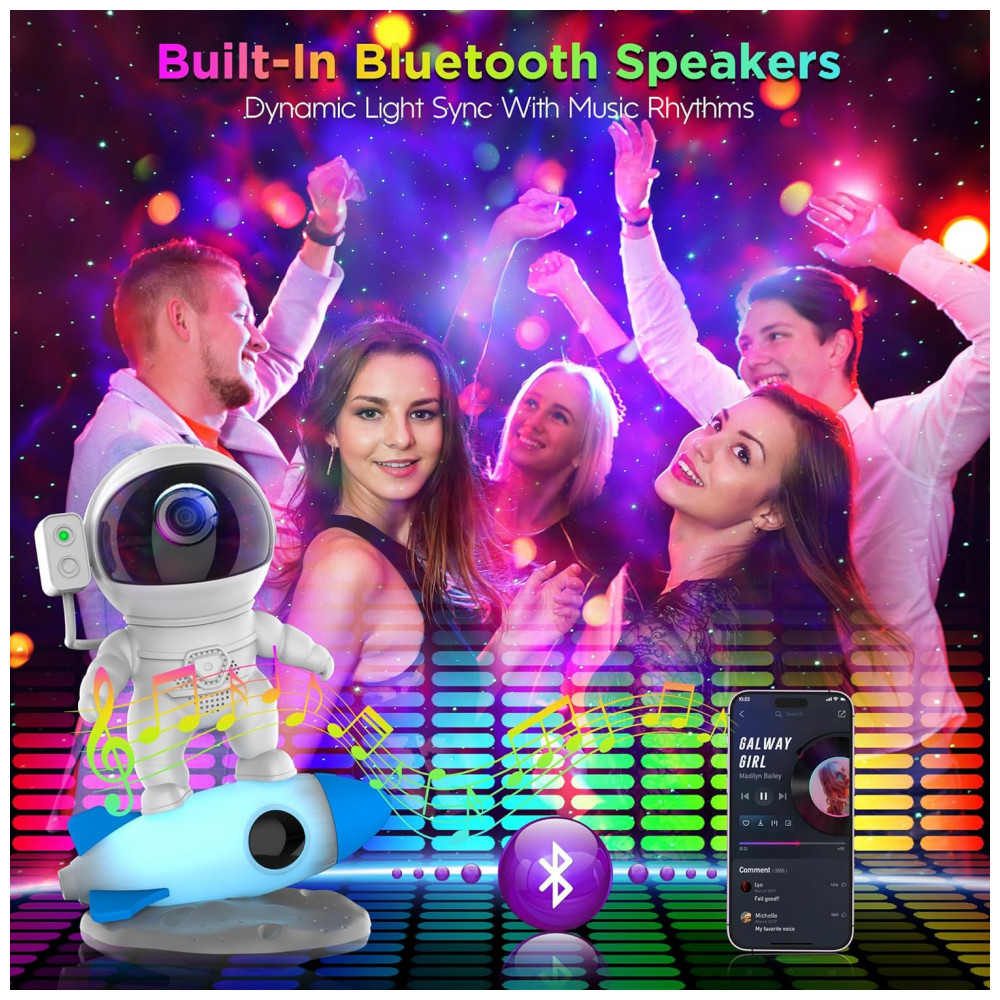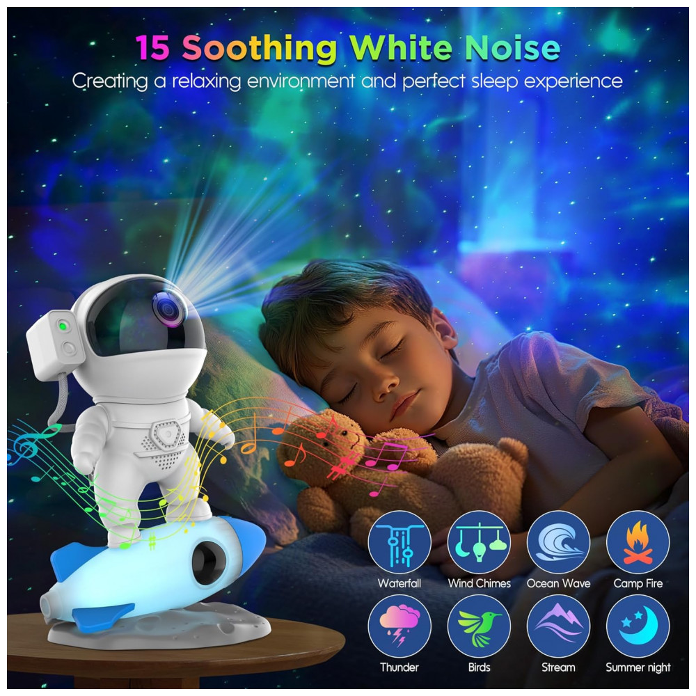 O Projetor de Galáxia Astronauta 4 em 1 combina projetor, luz noturna, máquina de ruídos brancos e alto-falante Bluetooth em um único dispositivo. Com design de luz noturna em formato de foguete e 9 cores, ele combina 10 incríveis efeitos de nebulosa com estrelas verdes cintilantes, projetando maravilhas da galáxia nas paredes ou teto do seu quarto. Controle o fluxo e brilho em 4 níveis via controle remoto ou APP, criando uma atmosfera serena perfeita para noites de cinema, encontros românticos ou jogos. Um presente decorativo único e encantador para quartos.
