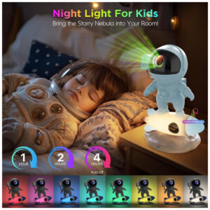 O Projetor de Galáxia Astronauta 4 em 1 combina projetor, luz noturna, máquina de ruídos brancos e alto-falante Bluetooth em um único dispositivo. Com 10 deslumbrantes efeitos de nebulosa e estrelas verdes cintilantes, o projetor cria maravilhas da galáxia nas paredes ou teto, permitindo ajustar a velocidade e brilho em 4 níveis via controle remoto ou APP. Seu design flexível permite projetar a galáxia em diversas superfícies, enquanto o alto-falante Bluetooth 5.1 oferece qualidade de som HD e modo rítmico. Também possui 15 sons relaxantes de ruídos brancos, timer e luz noturna separada.