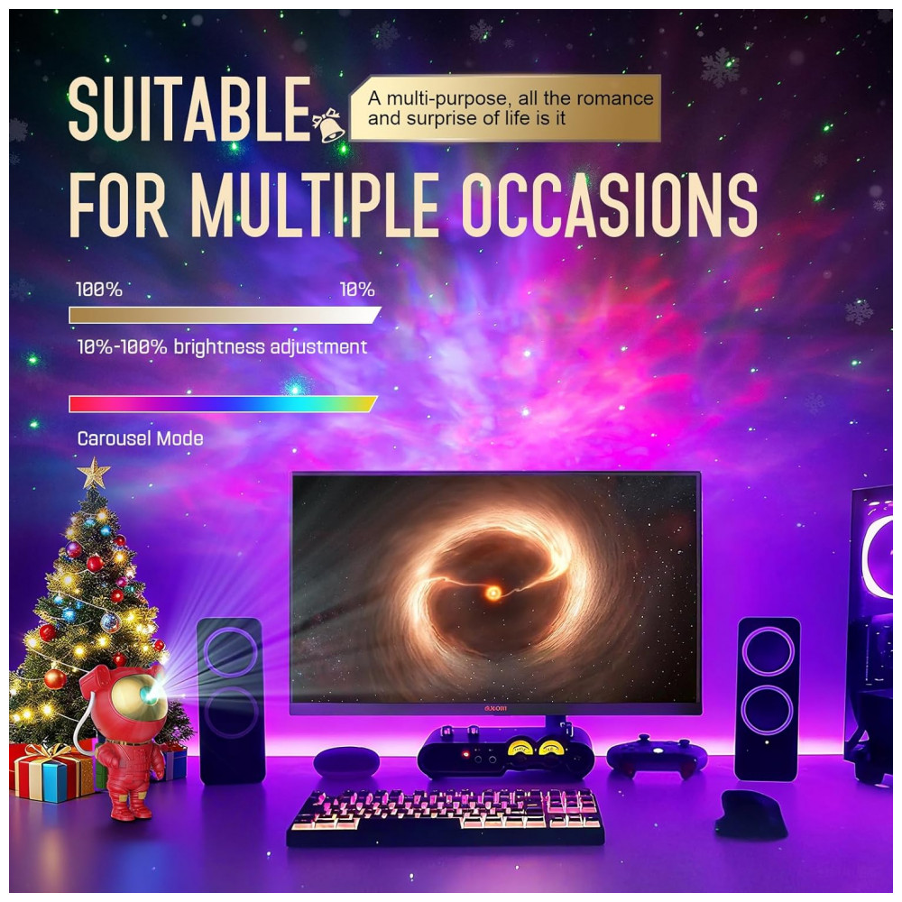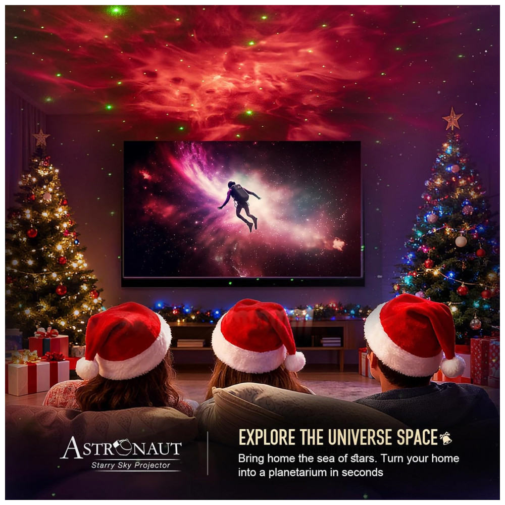 CRIE UM NATAL CRIMSON MÁGICO! Transforme sua casa em um cenário de maravilhas festivas nesta temporada de férias! Nosso projetor de astronauta em vermelho Crimson lança uma nebulosa vermelha quente e encantadora entrelaçada com brilhantes estrelas verdes, criando instantaneamente uma atmosfera natalina acolhedora e mágica. O projetor de luz de Natal perfeito para uso interno, substituindo as tradicionais luzes de Natal por uma decoração festiva única e moderna.