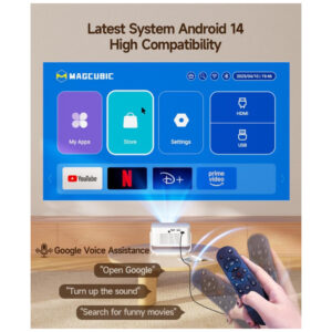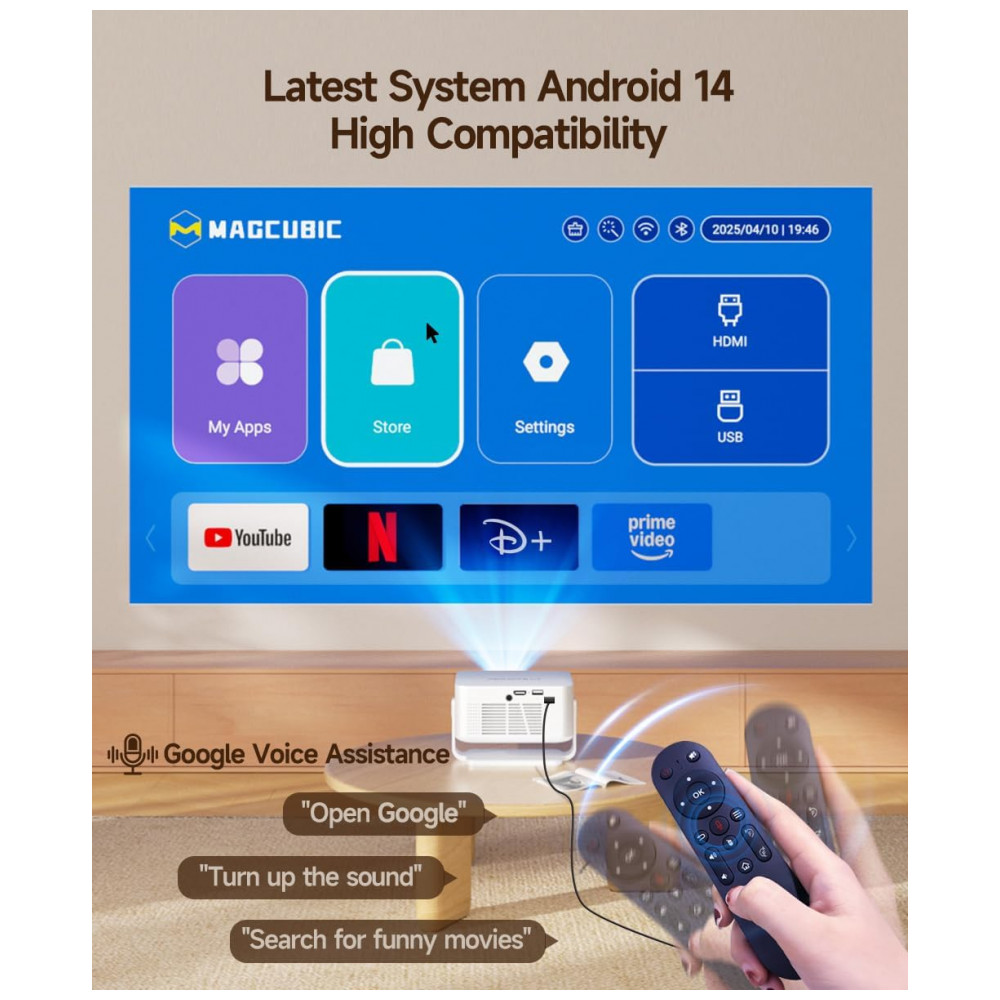 Projetor Inteligente 2025 Android 14 4K 8K WiFi 6 e Bluetooth 5.4 Auto Foco Keystone Vertical Automático Rotativo 180º Magcubic