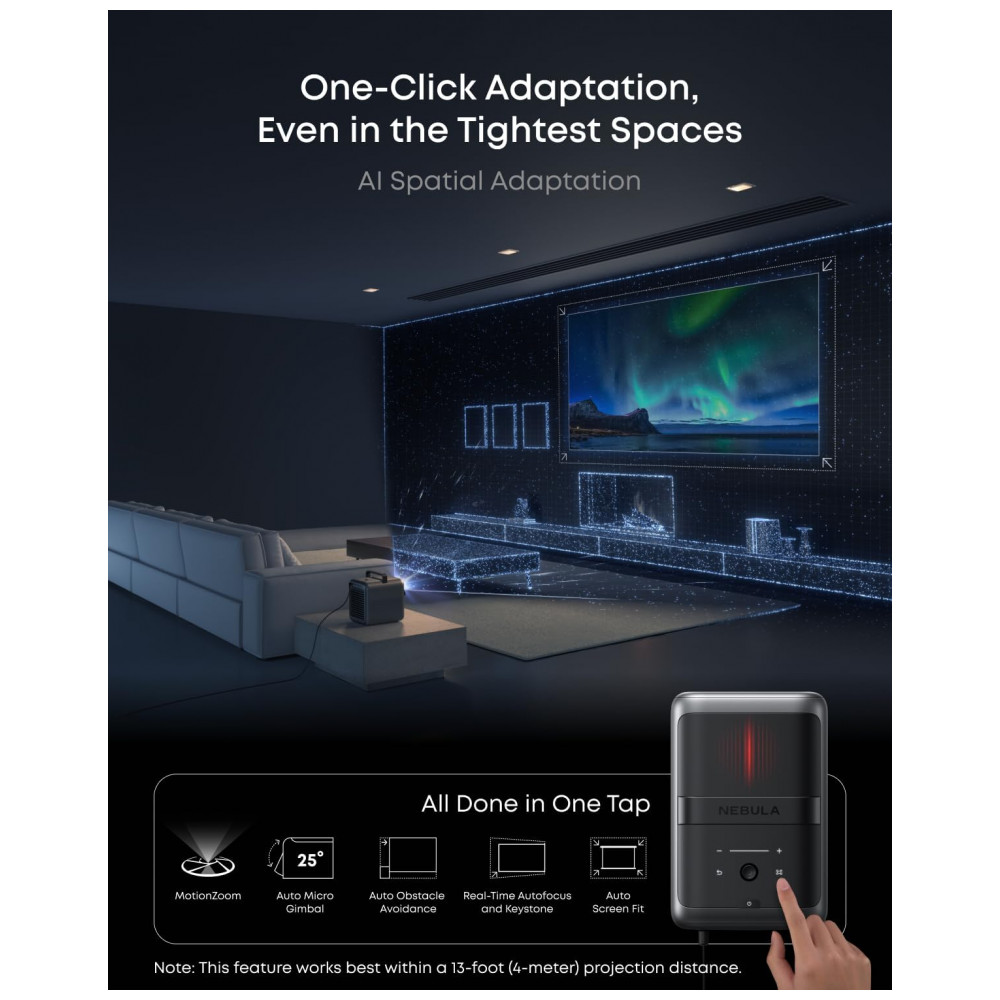 O NEBULA X1 é um projetor laser portátil 4K nativo (3840×2160) com motor óptico triple laser patenteado, entregando 3500 ANSI lúmens e 110% Rec. 2020, certificado ISF/TUV com suporte Dolby Vision para projeções de 102 a 762 cm (40 a 300 polegadas). Seus diferenciais incluem zoom óptico motorizado 0.9-1.5, íris de 6 lâminas (contraste nativo 5000:1, dinâmico 56.000:1), micro gimbal motorizado 25° para paredes altas, lente all-glass de 14 elementos e sistema de resfriamento líquido com ruído abaixo de 26 dB. Equipado com Google TV, adaptação espacial por IA, foco automático e evitação de obstáculos.