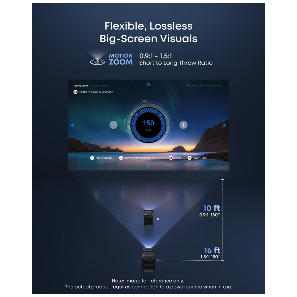 A distância de projeção varia de 1,69 a 4,78 m, com montagem em piso e Spatial Recall para configurações personalizadas por ambiente. Suporta conexão WiFi, Bluetooth, HDMI e USB para smartphones, laptops, tablets, consoles e alto-falantes, com áudio estéreo 40W. Ideal para home cinema, jogos ou negócios em diferentes espaços.