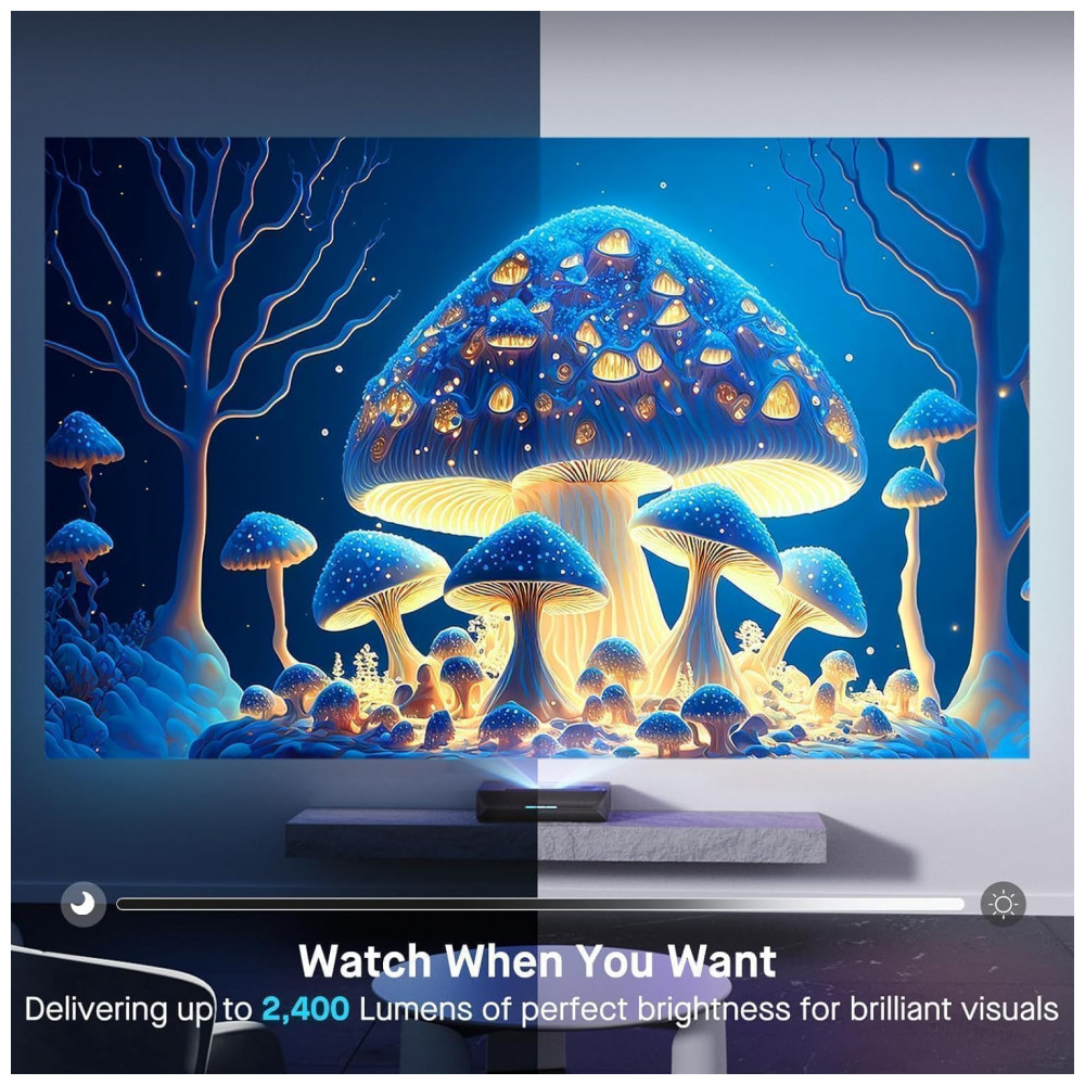 O projetor laser 4K NexiGo Aurora Pro com tela Fresnel ALR de 100″ é um sistema de projeção de ultracurta distância destinado a uso em cinema em casa e entretenimento em ambientes com luz ambiente controlada. Ele utiliza fonte de luz laser RGB com resolução 4K UHD, fluxo luminoso de 2400 lumens e processamento de imagem compatível com formatos de alto alcance dinâmico, incluindo Dolby Vision, HDR10 e HDR10+.