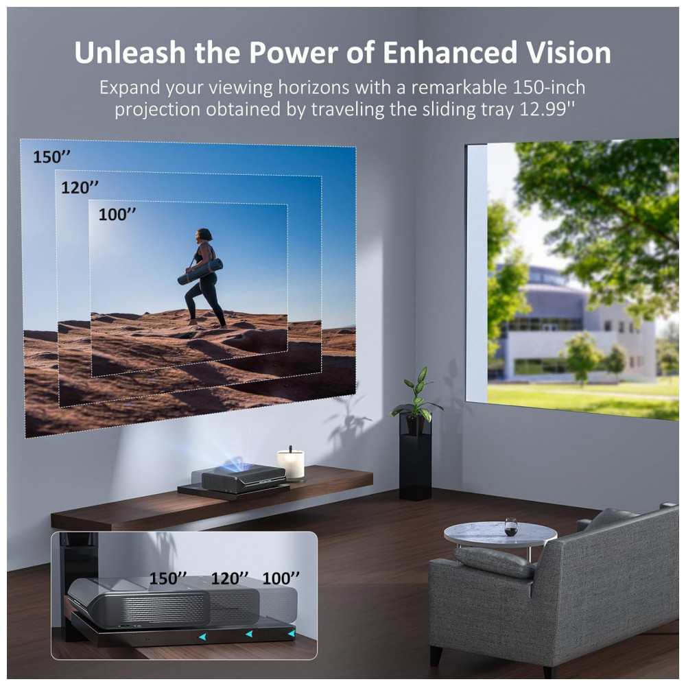 Tipo de produto: Projetor Laser TV 4K de foco ultracurto com tela Fresnel, bandeja motorizada e óculos 3D