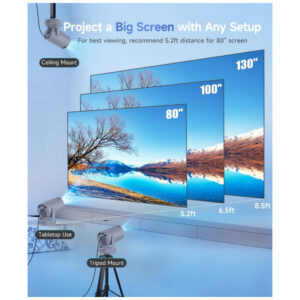 Para obter a melhor experiência visual, recomendamos uma distância de 1,58m para uma tela de 80 polegadas. Atualize o firmware para obter o melhor desempenho. Com 8000 lumens e uma taxa de contraste de 80001, este projetor oferece brilho suficiente para assistir filmes, programas infantis ou jogos. O alto-falante SoundBase de 5W melhora a experiência visual e auditiva, proporcionando som rico e imagens claras sem a necessidade de alto-falantes externos. Design versátil e portátil, pesando apenas 1 kg, permite instalação no teto, mesa, tripé ou rotação de 180º. Acesse 1.000.000 de vídeos com um clique, sem a necessidade de um TV stick externo. Controle intuitivo com controle remoto Air Mouse avançado, que combina controle remoto tradicional e mouse em um só, oferecendo navegação fluida e controle preciso. Suporta comandos de voz. Resolução nativa de 720P com suporte 4K, ideal para uso casual em quarto, área externa ou sala de estar. Opção acessível para criar uma experiência básica de cinema em casa.