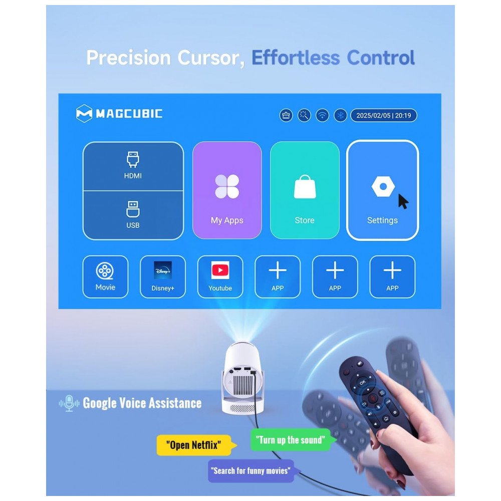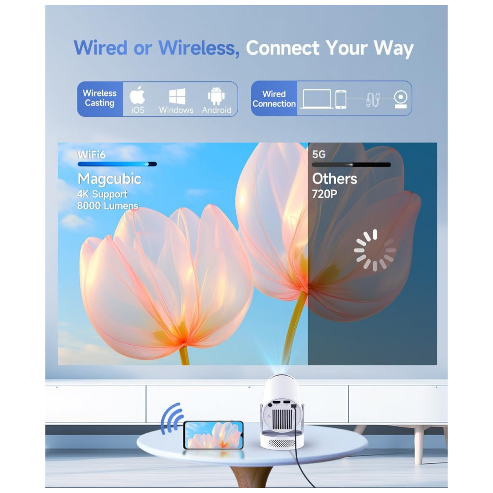 Projetor Magcubic Mini com WiFi 6 e Bluetooth 5.4 Suporte 4K Alto-falante Soundbase de 5W Keystone Vertical Automático Projetor Inteligente