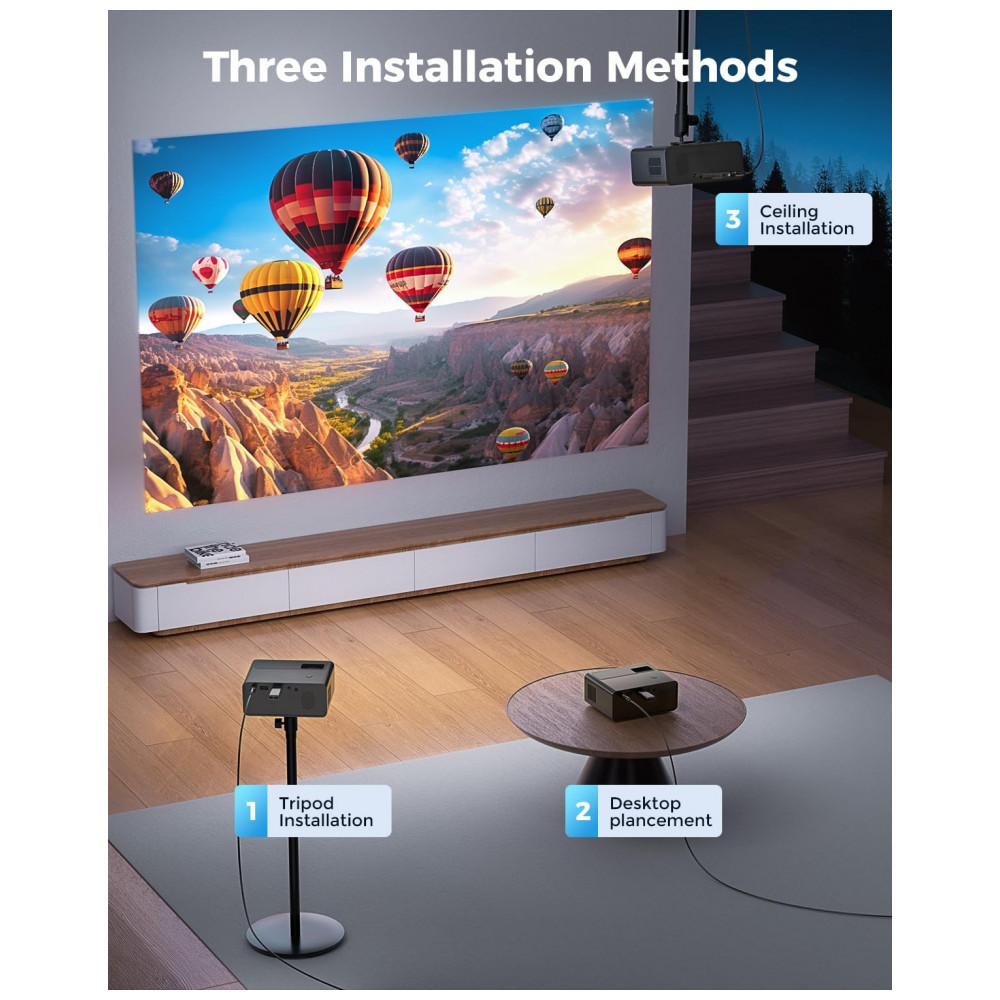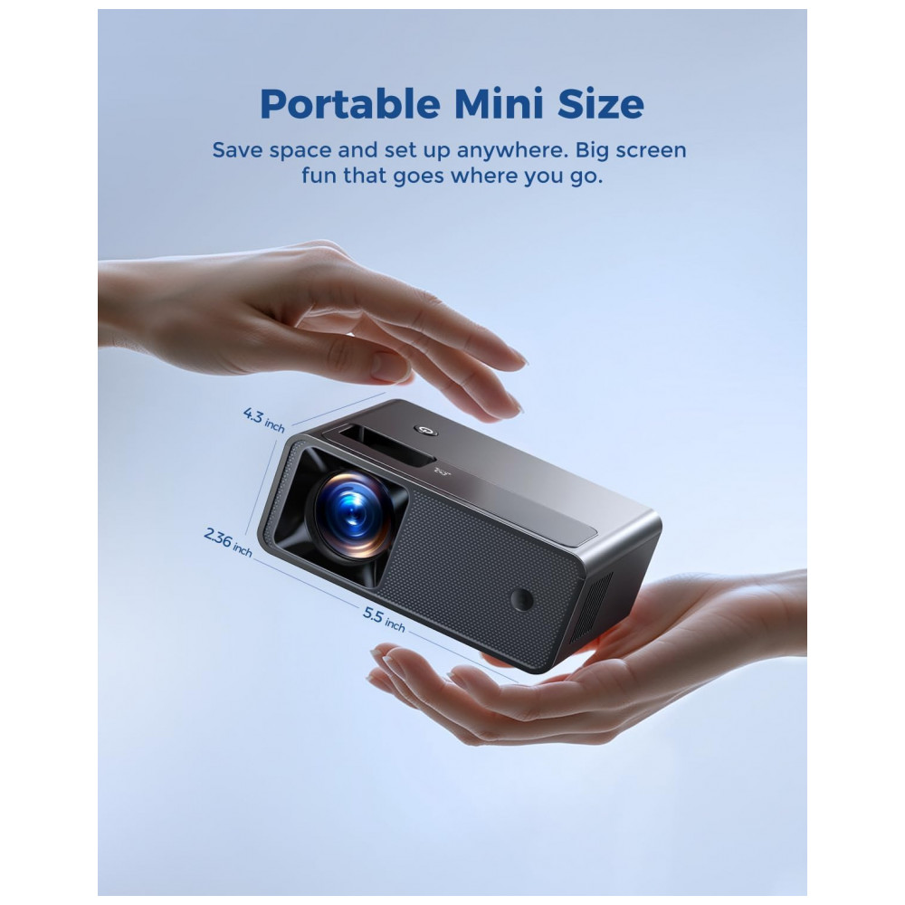 Com dimensões compactas de 14 cm x 6 cm x 11 cm e peso de 3 kg, facilita transporte para home theater, jogos, apresentações ou acampamentos. Inclui alto-falantes estéreo Hi-Fi integrados e saída de áudio 3,5 mm para fones ou caixas externas, com controle de temperatura que reduz ruído do ventilador em 80%.