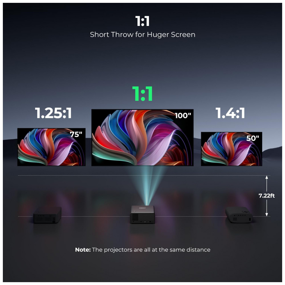 Com dimensões compactas de 17 cm x 14,5 cm x 7,6 cm e peso de 3 kg, projeta telas de 76 cm a 508 cm em distâncias mínimas de 0,81 m, alcançando 127 cm a partir de 0,91 m. Inclui alto-falante integrado e portas HDMI, USB 2.0 e saída 3,5 mm, compatível com consoles, laptops e tablets.