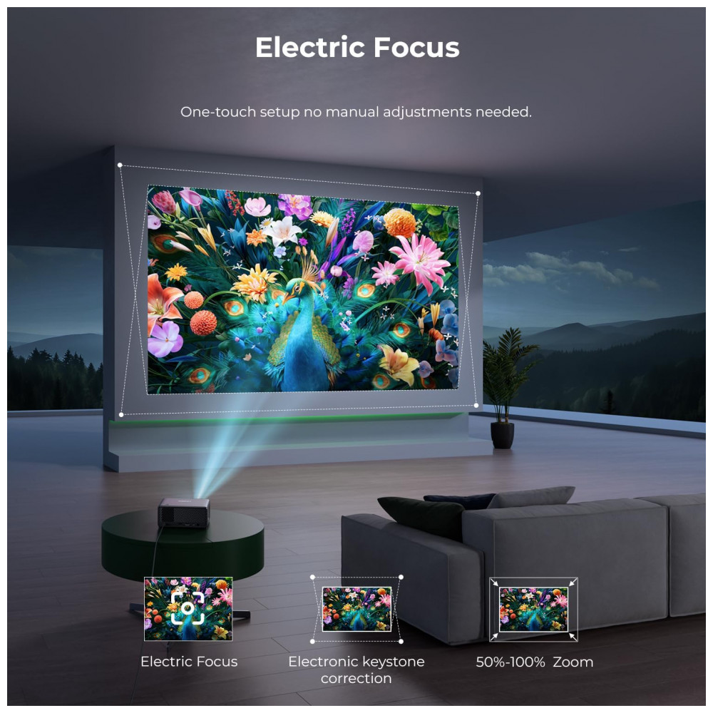 Outros: apps Netflix/YouTube/Prime Video; foco elétrico; correção keystone elétrica; montagem em mesa; compatível smartphones/laptops/consoles/tablets; indoor/outdoor; codificação AVC.