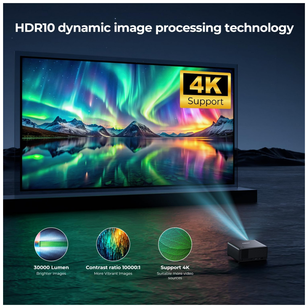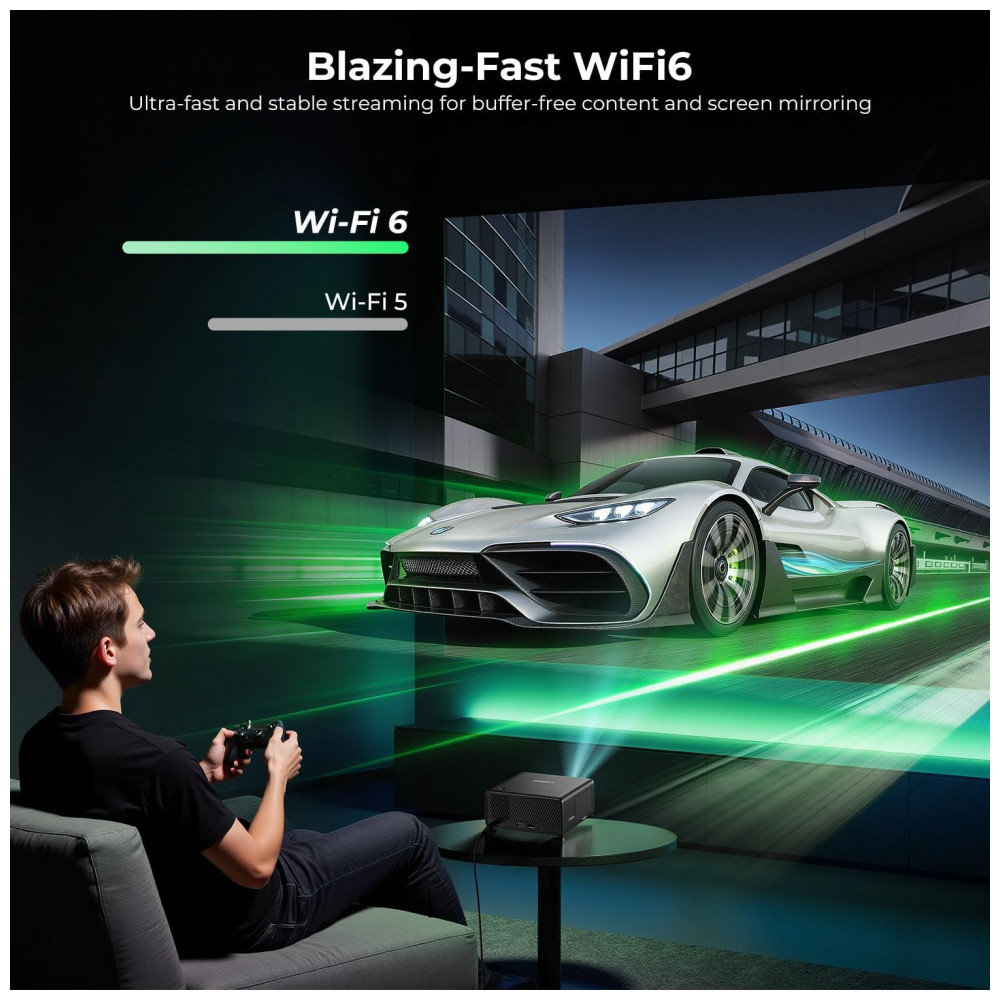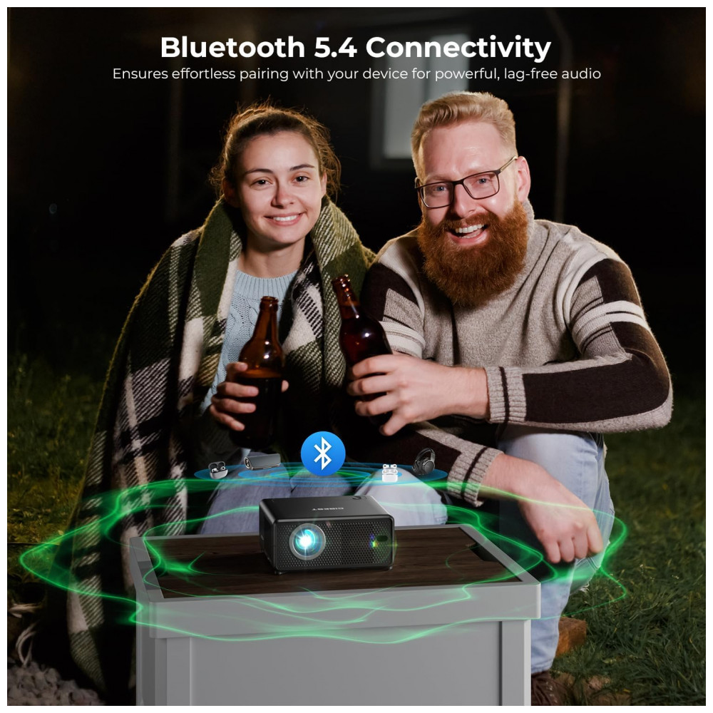 O Projetor Mini CiBest AC201 é um projetor portátil com resolução nativa 1080P, decodificação 4K e design short throw, adequado para projeção de filmes, esportes e jogos em ambientes internos ou externos. Ele possui apps pré-instalados como Netflix, YouTube e Prime Video, conectividade WiFi 6 para espelhamento de smartphones e Bluetooth 5.4 para alto-falantes, com foco e correção keystone elétricos por um clique.