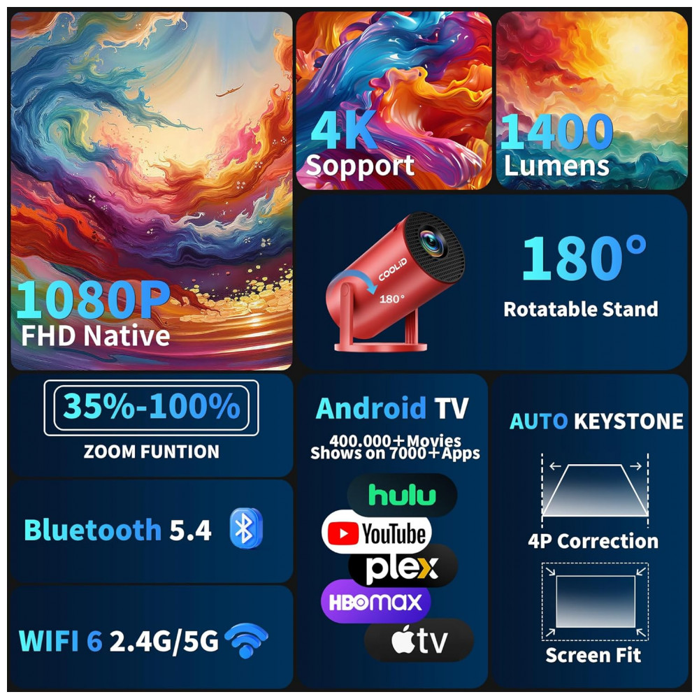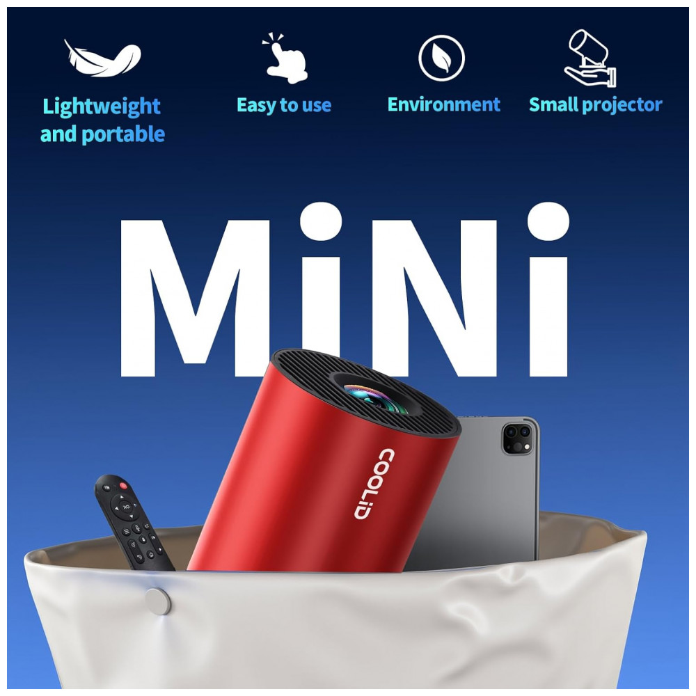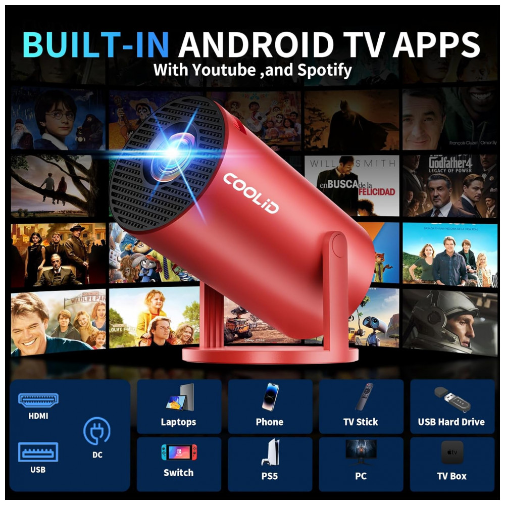 O Projetor Mini coolid C2 é um projetor portátil com resolução nativa 1080P e suporte a 4K HDR, equipado com aplicativos integrados como Prime Video, YouTube e D+, permitindo reprodução direta de vídeos sem dispositivos externos. Ele utiliza tecnologia WiFi 6 dual-band (2.4GHz/5GHz) e Bluetooth 5.4 para conexão estável com smartphones, laptops, tablets e consoles, com controle remoto a ar por giroscópio e mouse incluído.