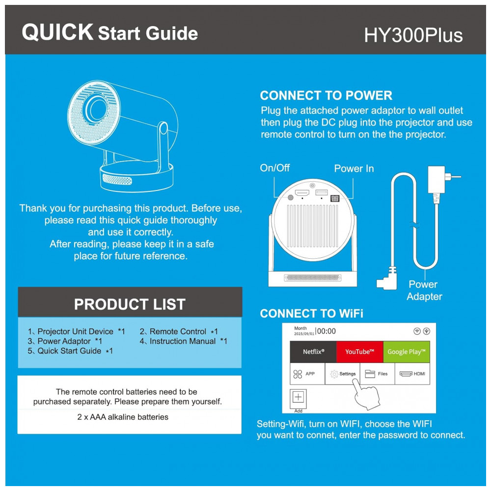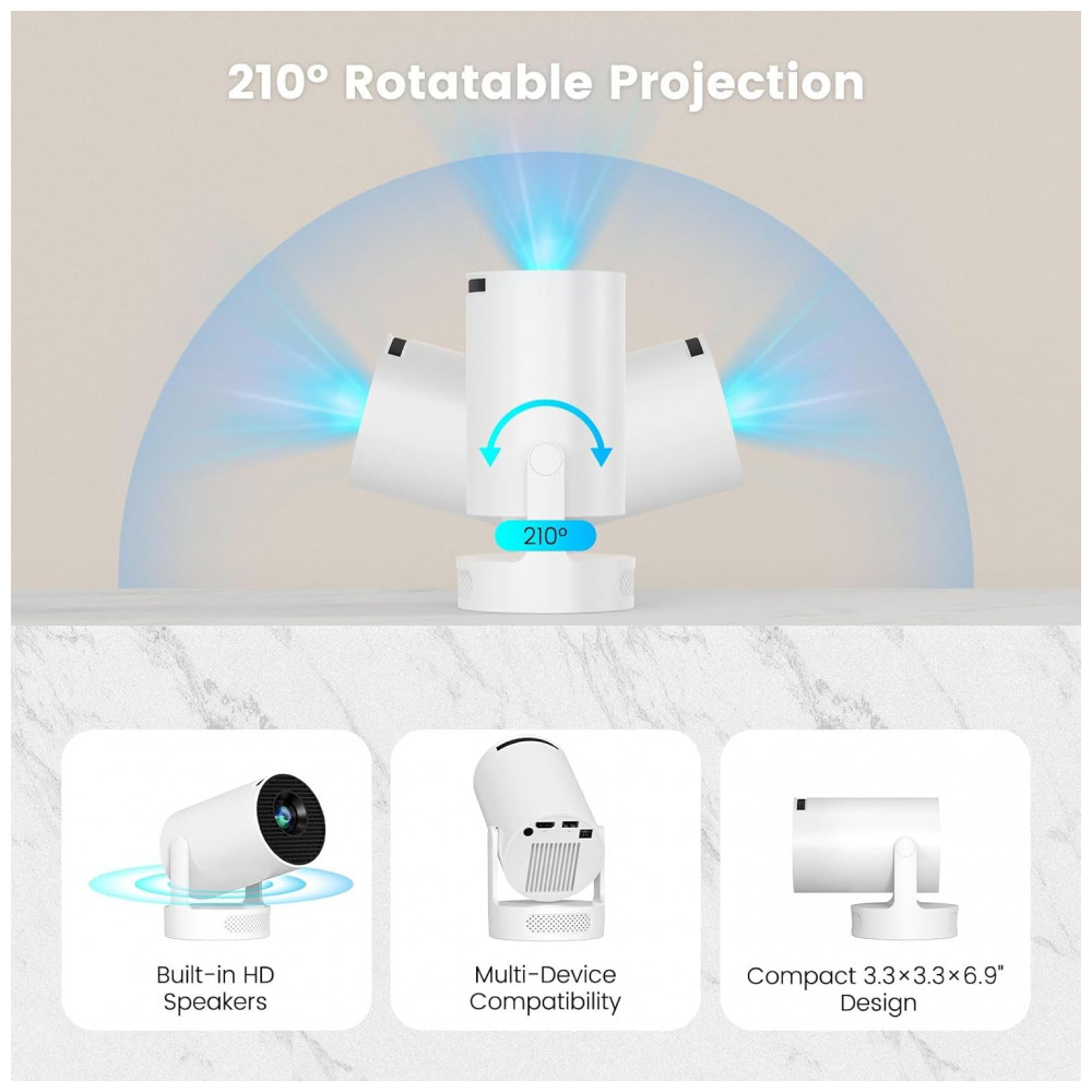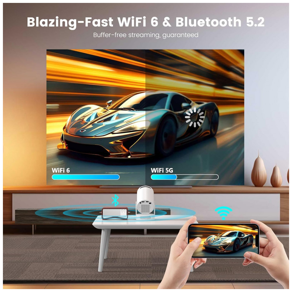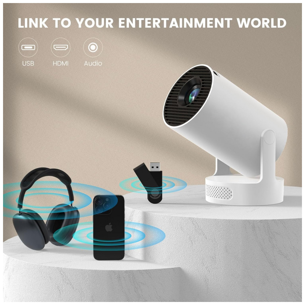 O Projetor Mini DreamFair HY300Plus é um projetor portátil com resolução nativa 1280×720 e suporte a 4K/1080P, adequado para projeção de vídeos, jogos e apresentações em ambientes internos ou externos. Ele utiliza WiFi 6 para conexão rápida com smartphones e laptops em até 5 segundos, GPU Mali-G31, Bluetooth 5.4 e foco elétrico automático com correção keystone automática, mantendo ruído baixo de até 25 dB.
