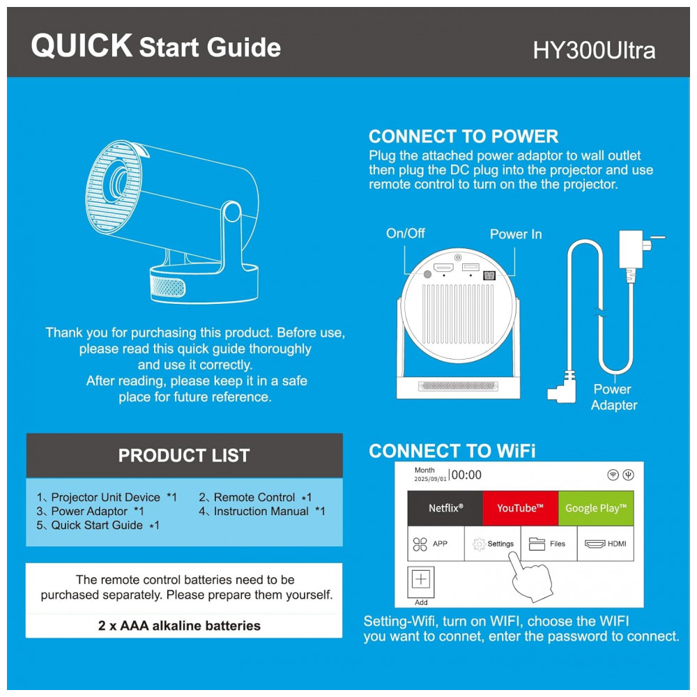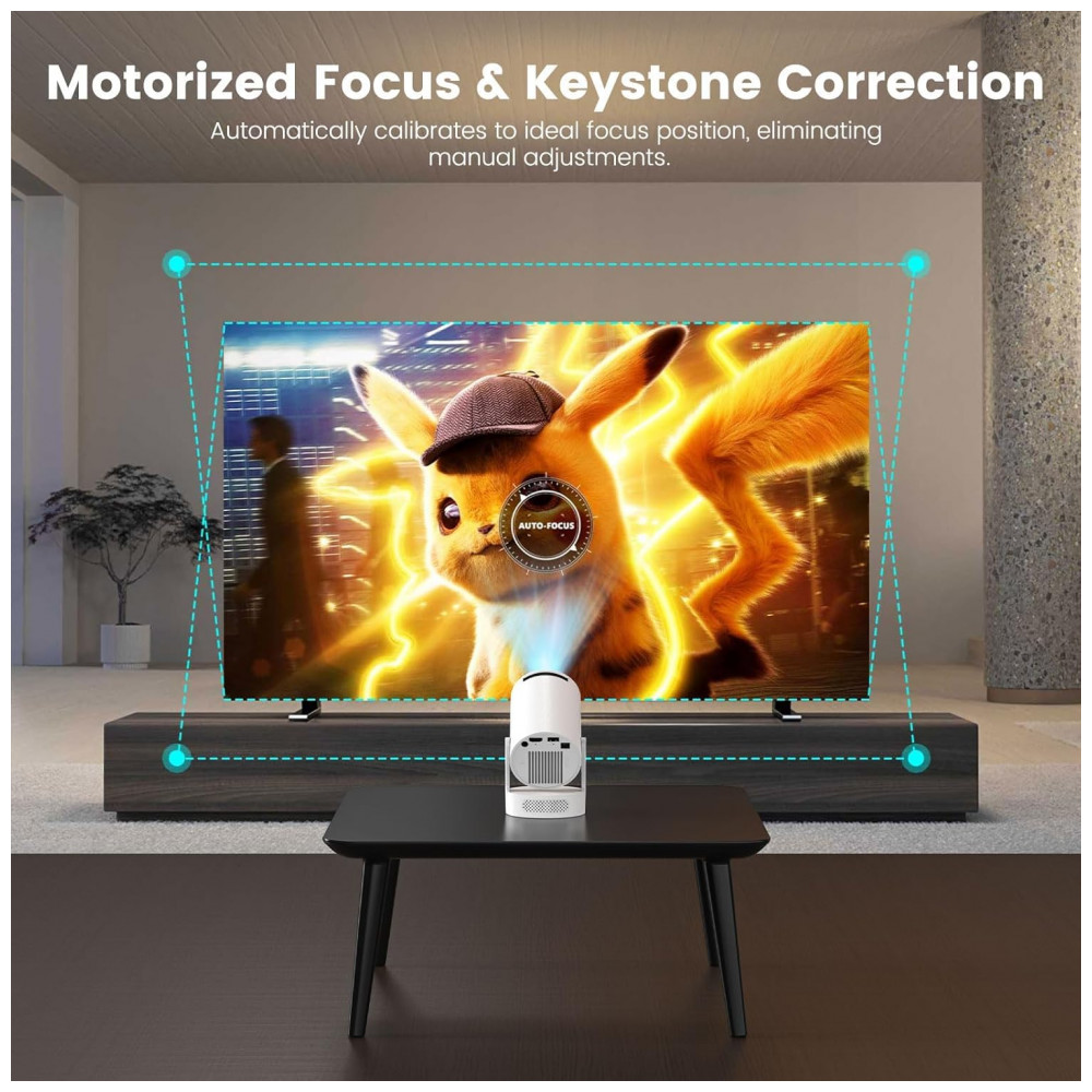 O Projetor Mini DreamFair HY300Ultra é um projetor portátil com resolução nativa 1280×720 e suporte a 4K, projetado para reprodução de vídeos, jogos e apresentações em ambientes internos ou externos. Ele possui rotação de 210°, WiFi 6 para espelhamento rápido de smartphones e laptops, Bluetooth 5.4 e correção keystone automática, com foco manual e ruído máximo de 25 dB.