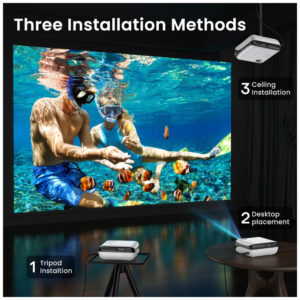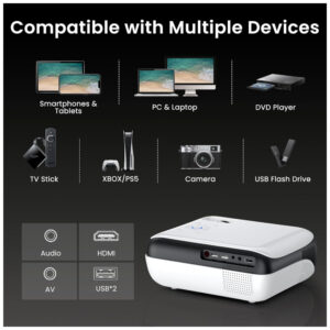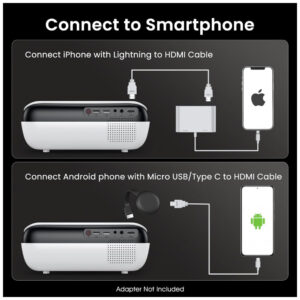 Resolução nativa Full HD 1080P: Tenha uma experiência visual cristalina com a resolução nativa de 1920×1080 do projetor HAPPRUN H1, proporcionando imagens mais nítidas, brilhantes e vibrantes para uma experiência imersiva de visualização. Ideal para montar um impressionante cinema em casa ou projetor para quarto. Tecnologia Bluetooth 5.1: Conecte o projetor via Bluetooth a caixas de som Bluetooth para uma experiência sonora mais rica e poderosa, ou emparelhe com fones de ouvido para uma visualização privada e imersiva sem incomodar os outros. Perfeito tanto para noites de filmes compartilhadas quanto para entretenimento pessoal, este projetor inteligente também é ótimo para usuários de iPhone. Alto-falantes Estéreo HiFi Integrados: Experimente um som rico e cristalino com os alto-falantes estéreo HiFi integrados do projetor H1. Perfeito para pequenos quartos ou noites aconchegantes de filmes, desfrute de áudio potente que dá vida a filmes, shows e jogos. Este pequeno projetor é ideal para uso no quarto ou ao ar livre. Compatibilidade Perfeita com TV Sticks: O projetor de TV HAPPRUN se integra facilmente com os populares TV Sticks como o Fire TV Stick, Chromecast e outros, oferecendo acesso a uma vasta biblioteca de conteúdo para streaming. Aproveite uma experiência de visualização premium que rivaliza com TVs de alta qualidade, tudo a uma fração do custo. Observação: os TV Sticks não estão incluídos. Aviso de Compatibilidade: Este mini projetor funciona com smartphones e tablets, mas requer um adaptador HDMI (não incluído). Para iOS, use um adaptador Lightning para HDMI oficial. Para Android, se o seu telefone suportar MHL, use um cabo Micro USB para HDMI ou USB tipo C para HDMI (não incluído). Caso contrário, é recomendado um Chromecast para espelhamento sem fio. Desfrute de uma experiência perfeita em uma tela grande com este versátil projetor para celular!