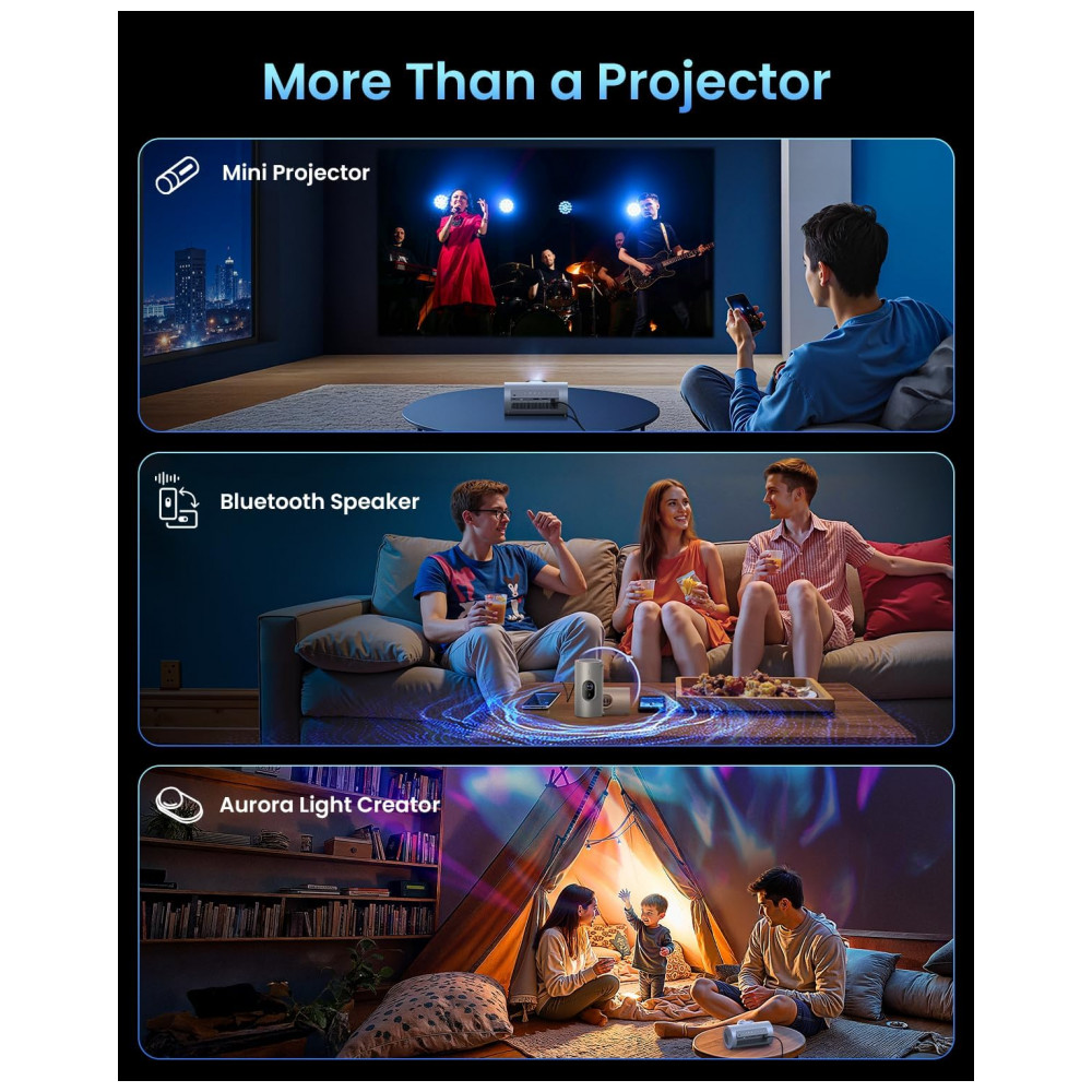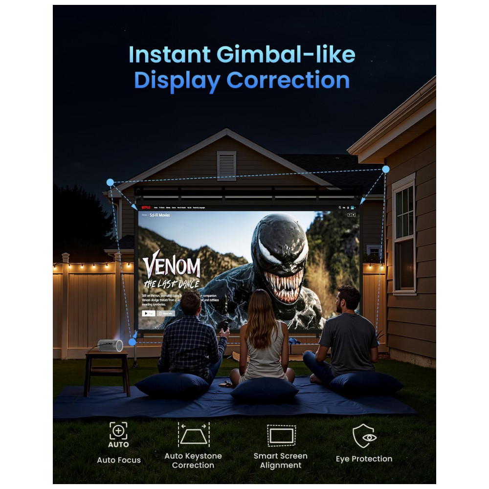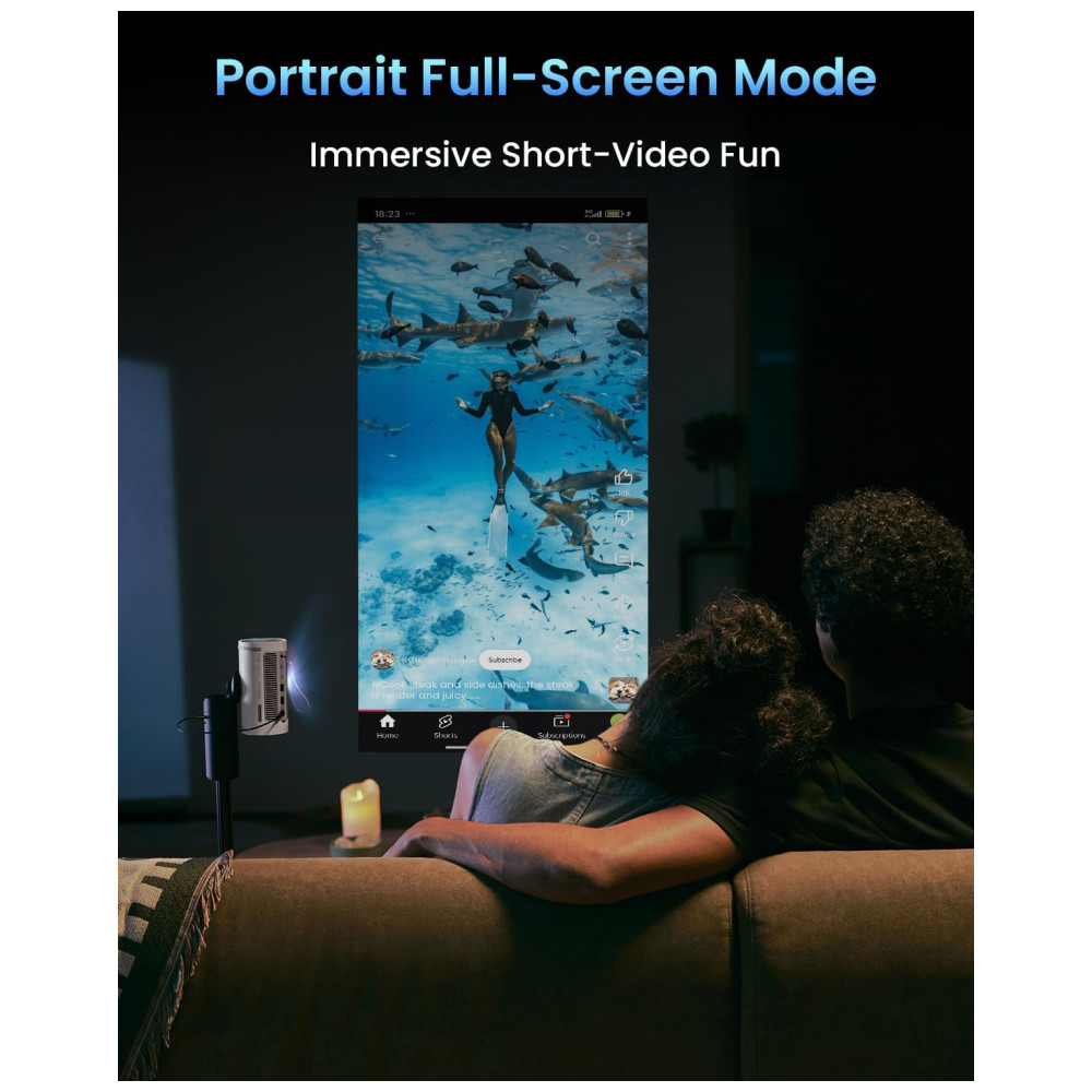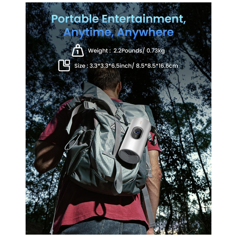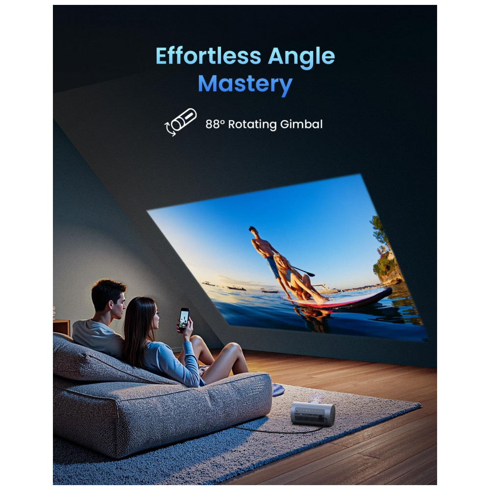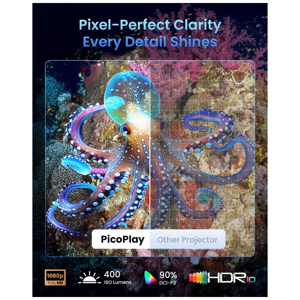 O Projetor Mini Portátil JMGO PicoPlay apresenta tecnologia LED com resolução nativa 1920 x 1080 pixels, brilho de 400 lumens ISO e gama de cores de 90% DCI-P3 para projeção precisa em telas de até 200 polegadas. O sistema FlexiSmart e gimbal rotativo 88° promovem ajuste automático da imagem, permitindo projeções versáteis de parede a teto.