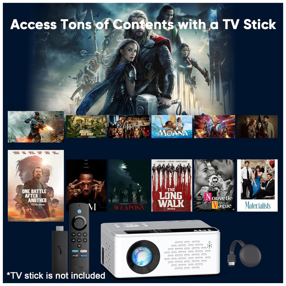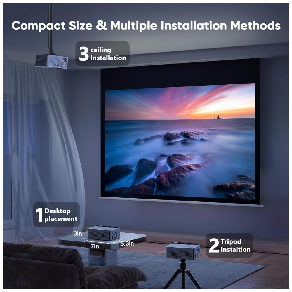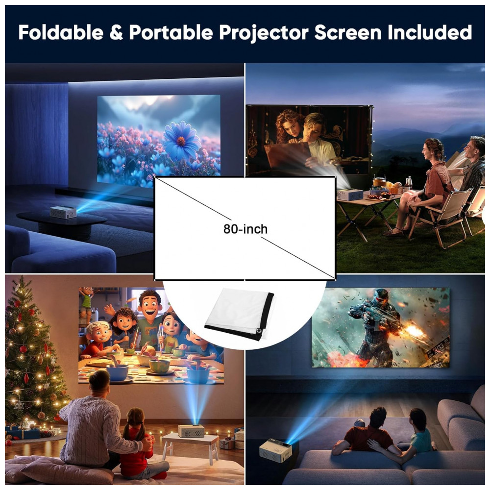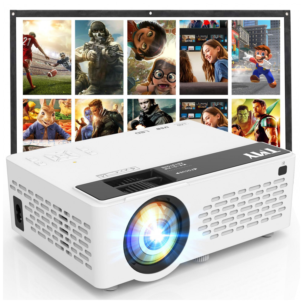 O TMY V08 é um projetor mini portátil com resolução nativa 1280×720 e suporte a 1080P Full HD, adequado para uso interno e externo em home cinema, exibição de fotos, slideshows e jogos de vídeo. Inclui tela de projeção dobrável, antirrugas e lavável, permitindo configuração rápida de cinema em casa em qualquer local, com ângulos de visão amplos e detalhes aprimorados na imagem.