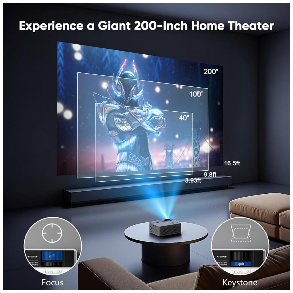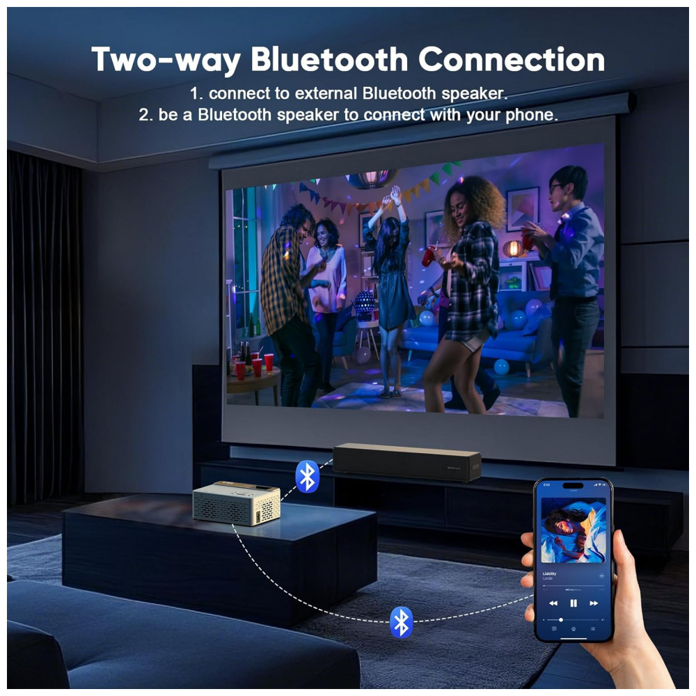 Equipado com alto-falante interno e Bluetooth 5.1 bidirecional para sincronização de áudio com caixas ou fones (apenas transmissão de áudio, não espelhamento de tela), oferece experiência audiovisual sem necessidade de alto-falantes externos. Suporta proporções 4:3/16:9, contraste 5000:1 e tamanhos de imagem de 81 cm a 5 m (32 a 220 polegadas), com distâncias de projeção de 1,1 m a 6 m e iluminação uniforme sem áreas escuras nas bordas.
