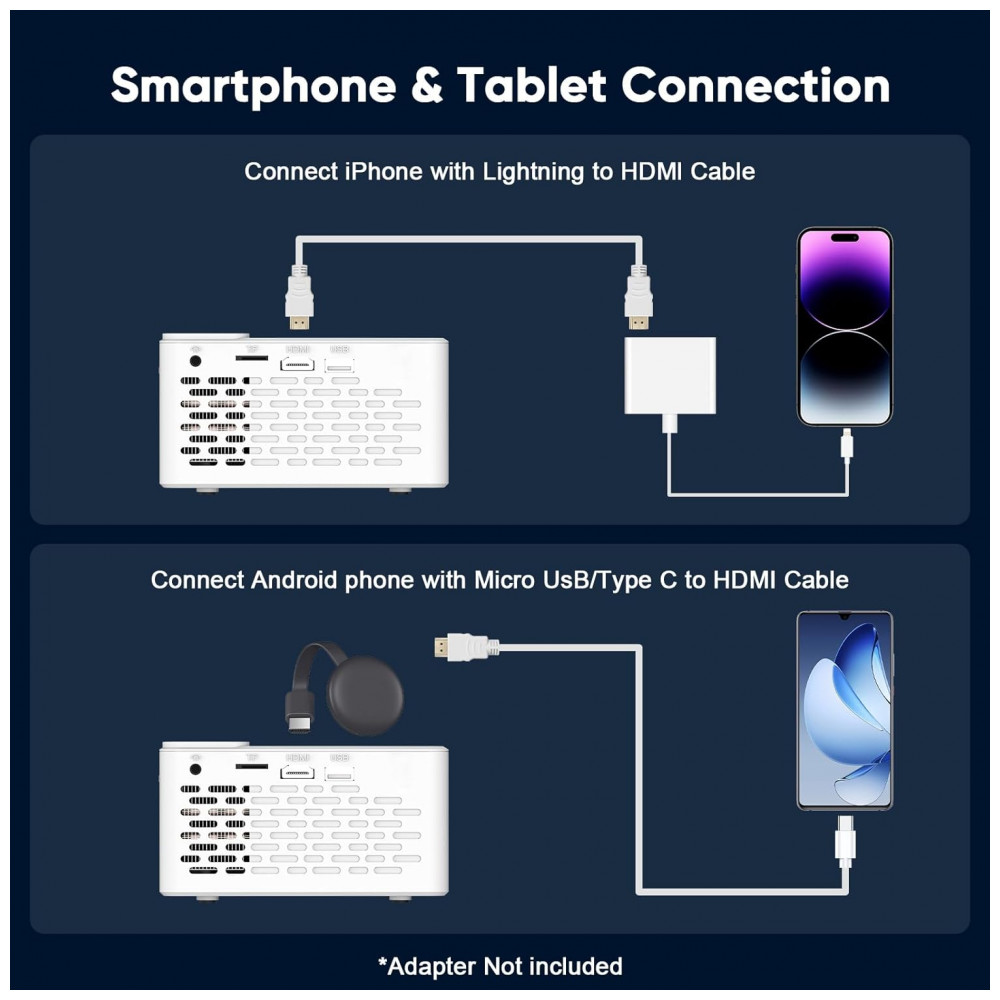 Compatível com smartphones, tablets, consoles de jogos e laptops via HDMI, USB 2.0, 3.5mm jack ou adaptadores (Lightning para iOS ou MHL/Type-C para Android; adaptadores não inclusos). Vida útil da lâmpada LED de 60.000 horas. Nota: devido a HDCP, espelhamento de apps como Prime Video requer TV Stick ou similar via HDMI.