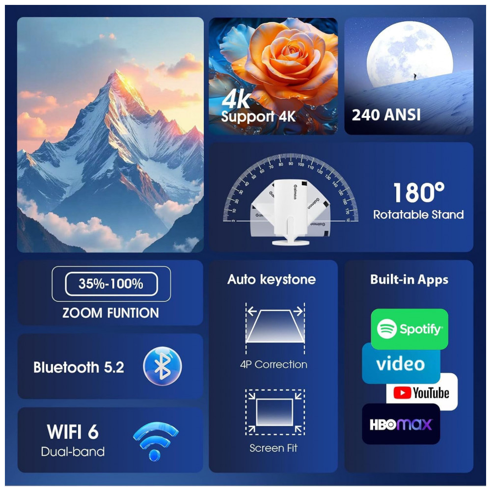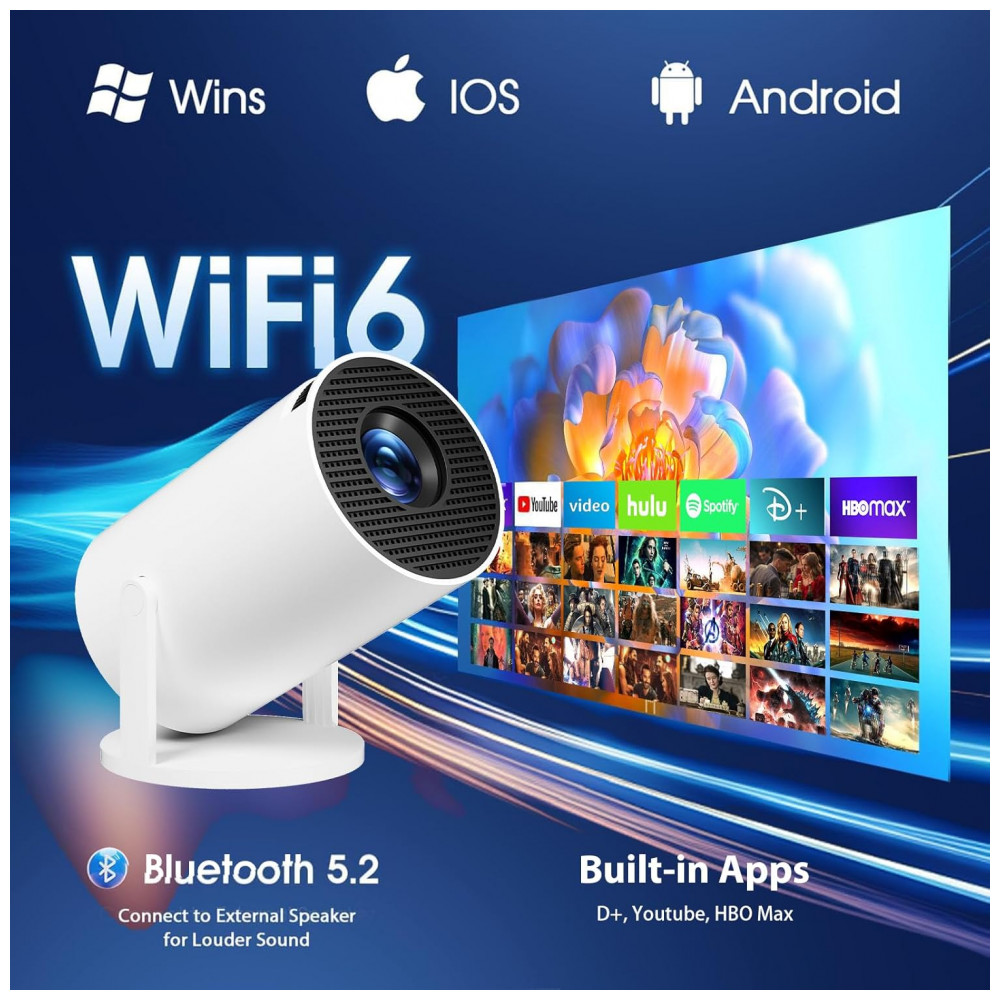 Equipado com WiFi 6 dual-band e Bluetooth 5.2 bidirecional para conexões rápidas e estáveis, permite pareamento com caixas, fones ou uso do celular como alto-falante, complementado por speaker HiFi interno. Tecnologia LCD com HDR para contraste e cores aprimorados, correção automática de keystone, rotação 180°, foco manual por roda e zoom digital 35%-100%.