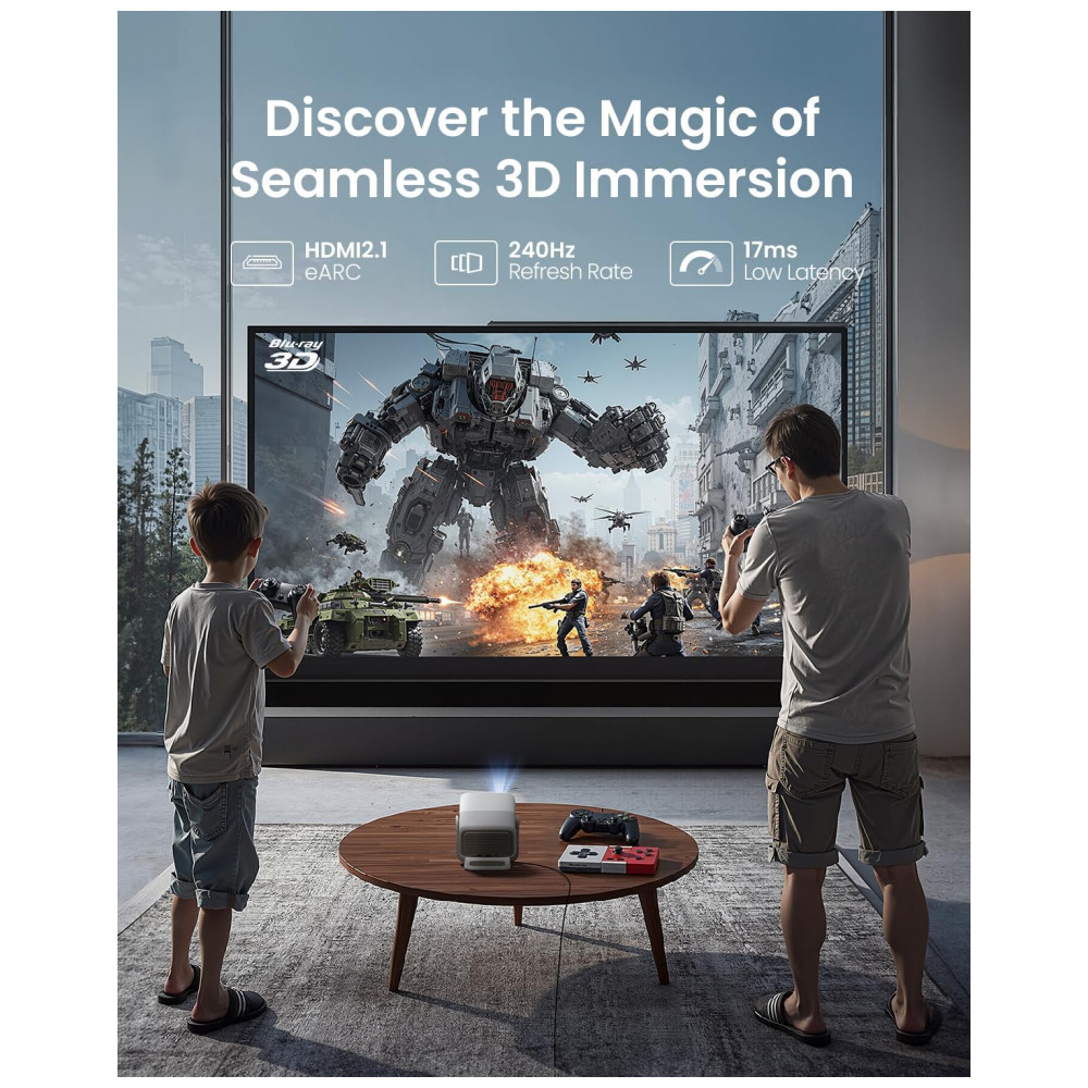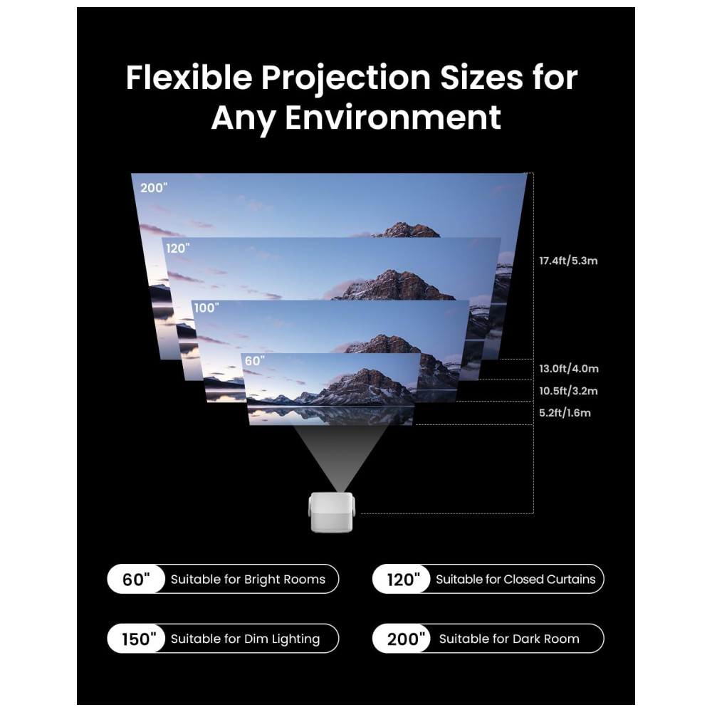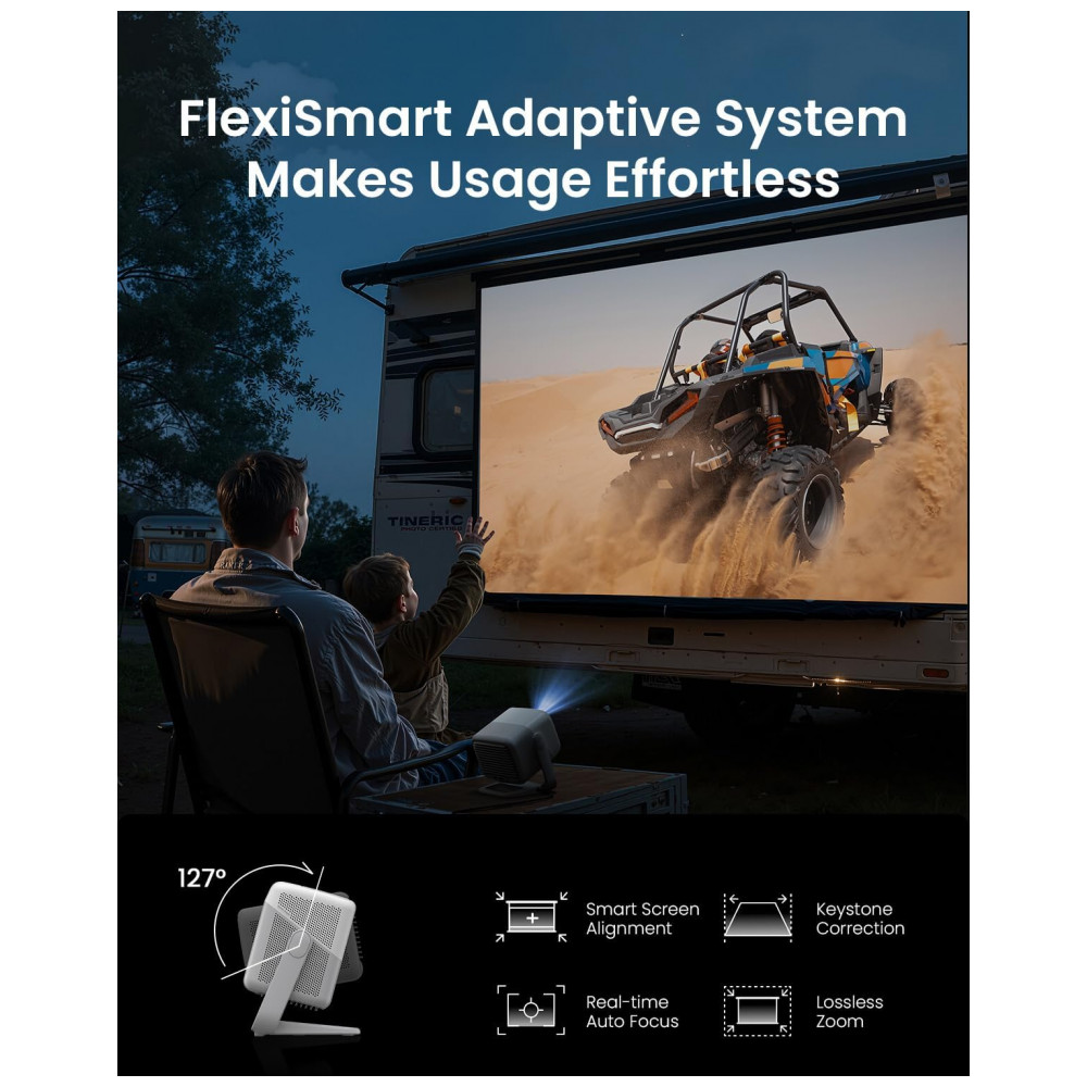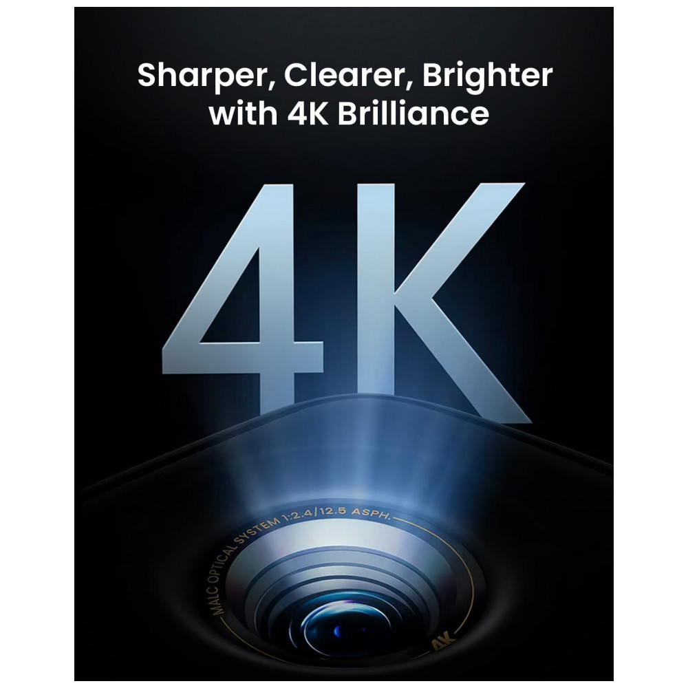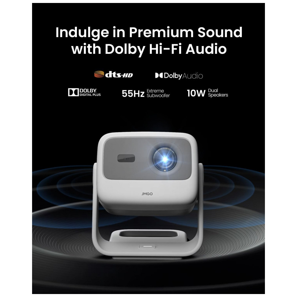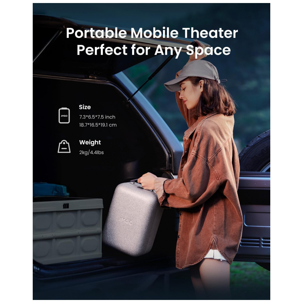 O projetor portátil JMGO N1S 4K oferece resolução nativa 3840 x 2160 pixels com tecnologia avançada de laser triplo RGB MALC 2.0, brilho de 1100 ISO lumens e contraste de 1.000.000:1 para imagens vibrantes, com cobertura 110% BT.2020 e 151% DCI-P3. Equipado com sistema FlexiSmart Adaptive 2.0, apresenta autofoco e correção automática de keystone em tempo real para imagens nítidas em telas de até 200 polegadas, com proteção ocular inteligente para pessoas e pets.