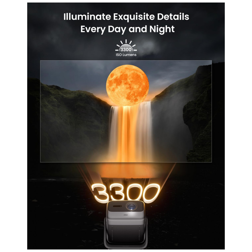 O projetor portátil JMGO N1S Ultimate 4K traz resolução nativa 3840 x 2160 pixels com tecnologia avançada de laser triplo RGB, brilho de 3300 ISO lumens e contraste de 1600:1, garantindo imagens vibrantes com precisão de cor ΔE<1 e cobertura de 110% do espaço BT.2020. Equipado com sistema FlexiSmart 2.0, oferece correção automática de keystone e foco em tempo real, adaptando-se a qualquer iluminação, cor de parede ou tamanho de tela de até 300 polegadas, com proteção ocular reforçada por sensores 3D-TOF e câmera CMOS.