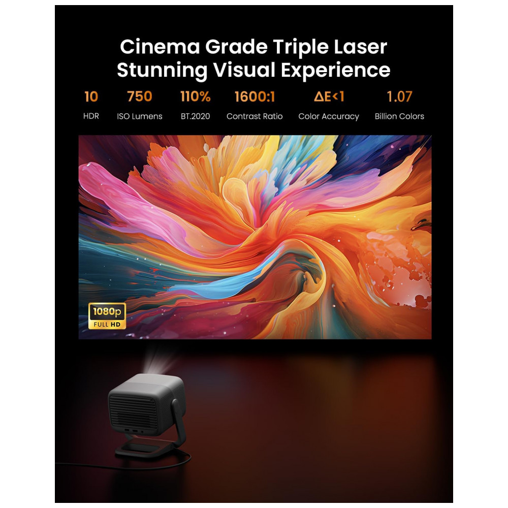 O Projetor Portátil Laser Triplo JMGO N1 apresenta resolução nativa Full HD 1920 x 1080 pixels com suporte a 4K, tecnologia MALC de laser triplo colorido, 800 lumens CVIA e contraste de 1600:1, projetando imagens em telas de até 200 polegadas com distância mínima de 1 m e máxima de 5 m. O sistema gimbal integrado permite rotação vertical de 127° e horizontal de 360°, com correção automática de quilha, foco e alinhamento via Multi Adaptive System, incluindo memória de tela e compatibilidade com 3D. Equipado com Android TV 11.0, Google Play, Google Assistant e Chromecast, suporta codificação de vídeo H.264 ou H.265 para reprodução fluida de conteúdos.