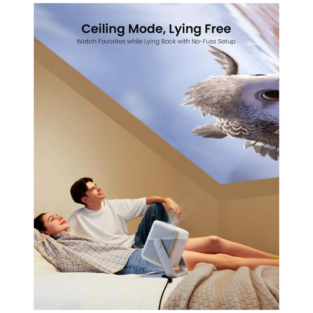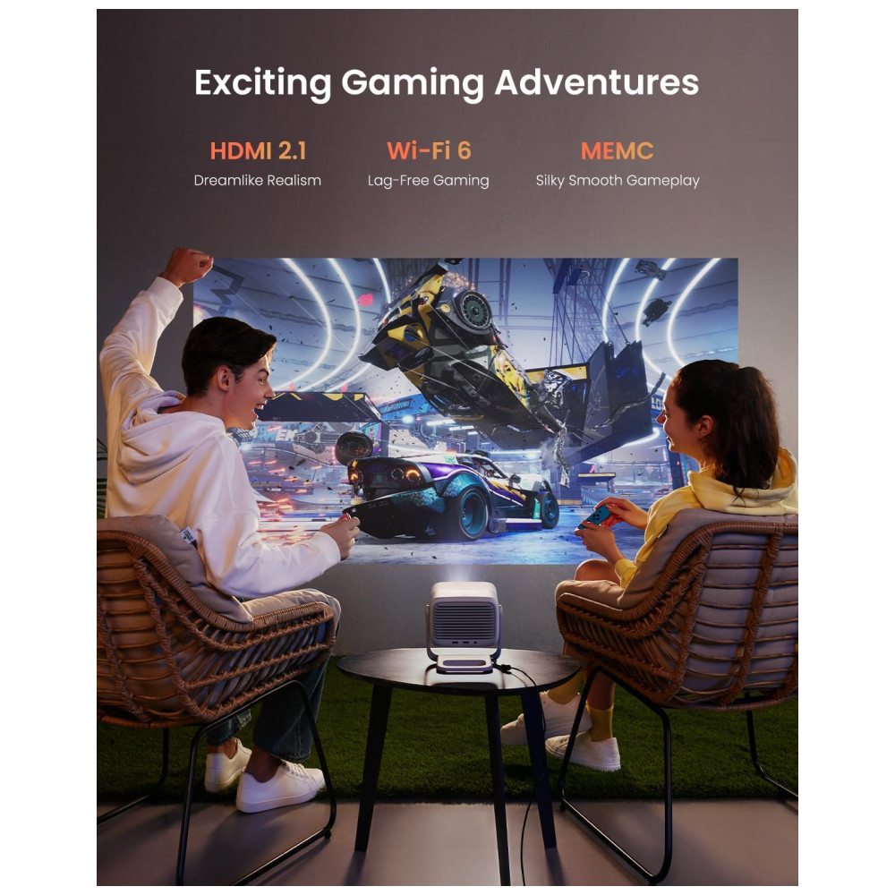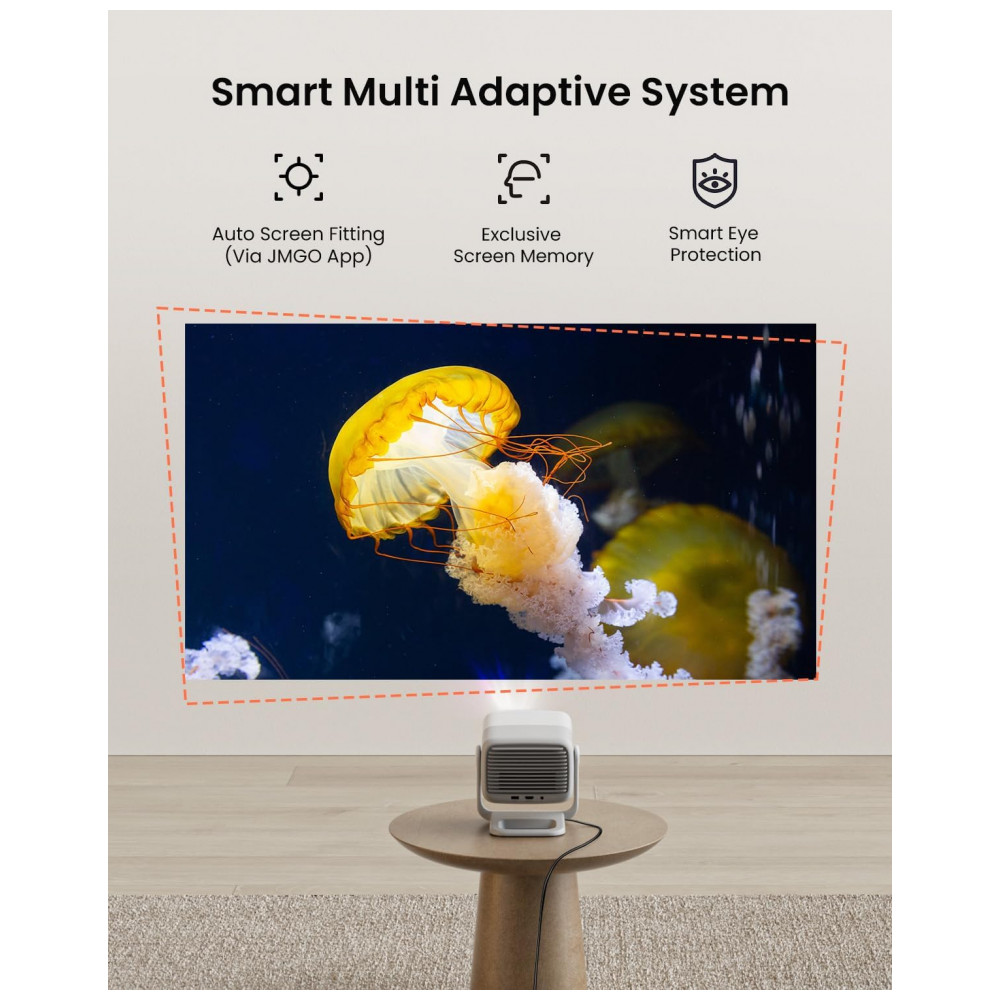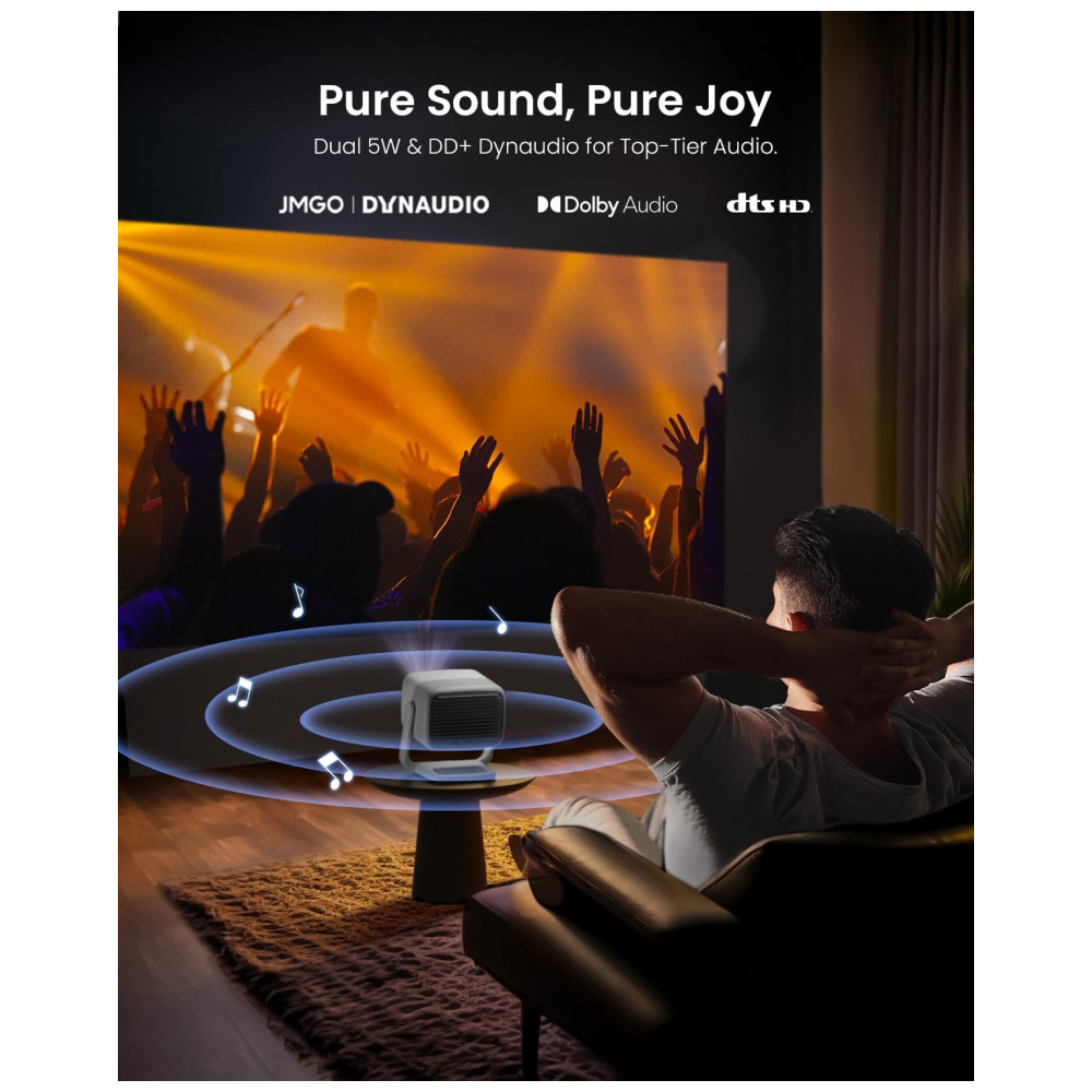 Oferece conectividade HDMI 2.1, USB, Wi-Fi, Bluetooth e saída de áudio 3,5 mm, compatível com laptops, consoles de jogos, smartphones e tablets, com controle via aplicativo JMGO ou remoto. Os alto-falantes duplos de 5 W com Dynaudio, Dolby Audio e DTS proporcionam áudio surround de 360°, com nível de ruído ≤26 dB e consumo de 100 W. O design portátil em formato de mesa ou teto inclui foco automático e zoom digital para configuração rápida em diversos ambientes.
