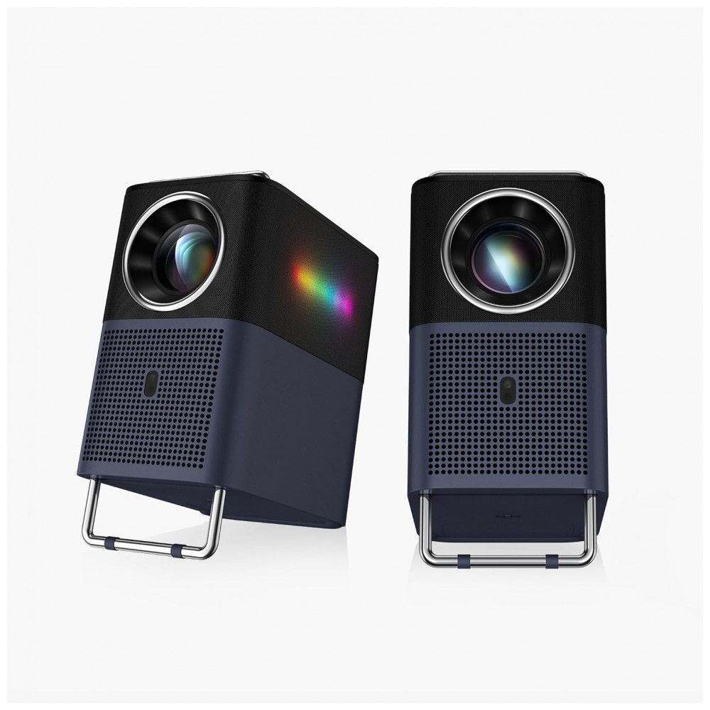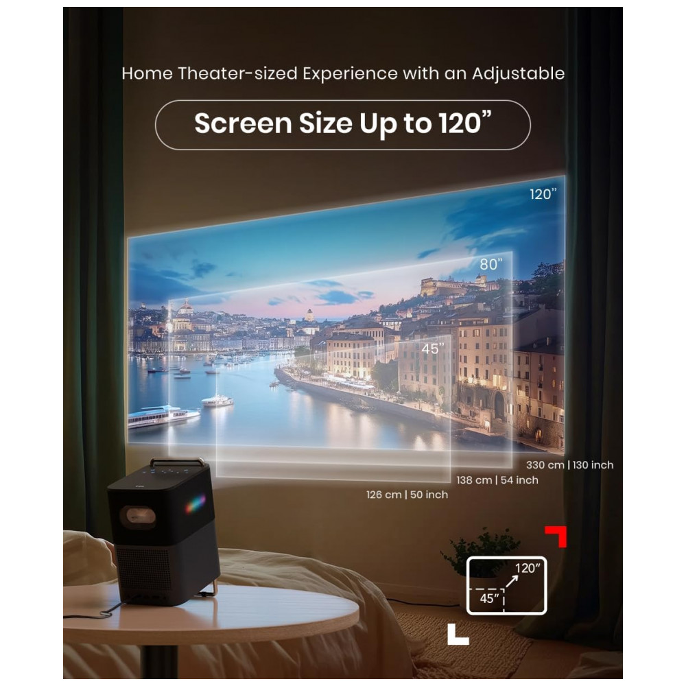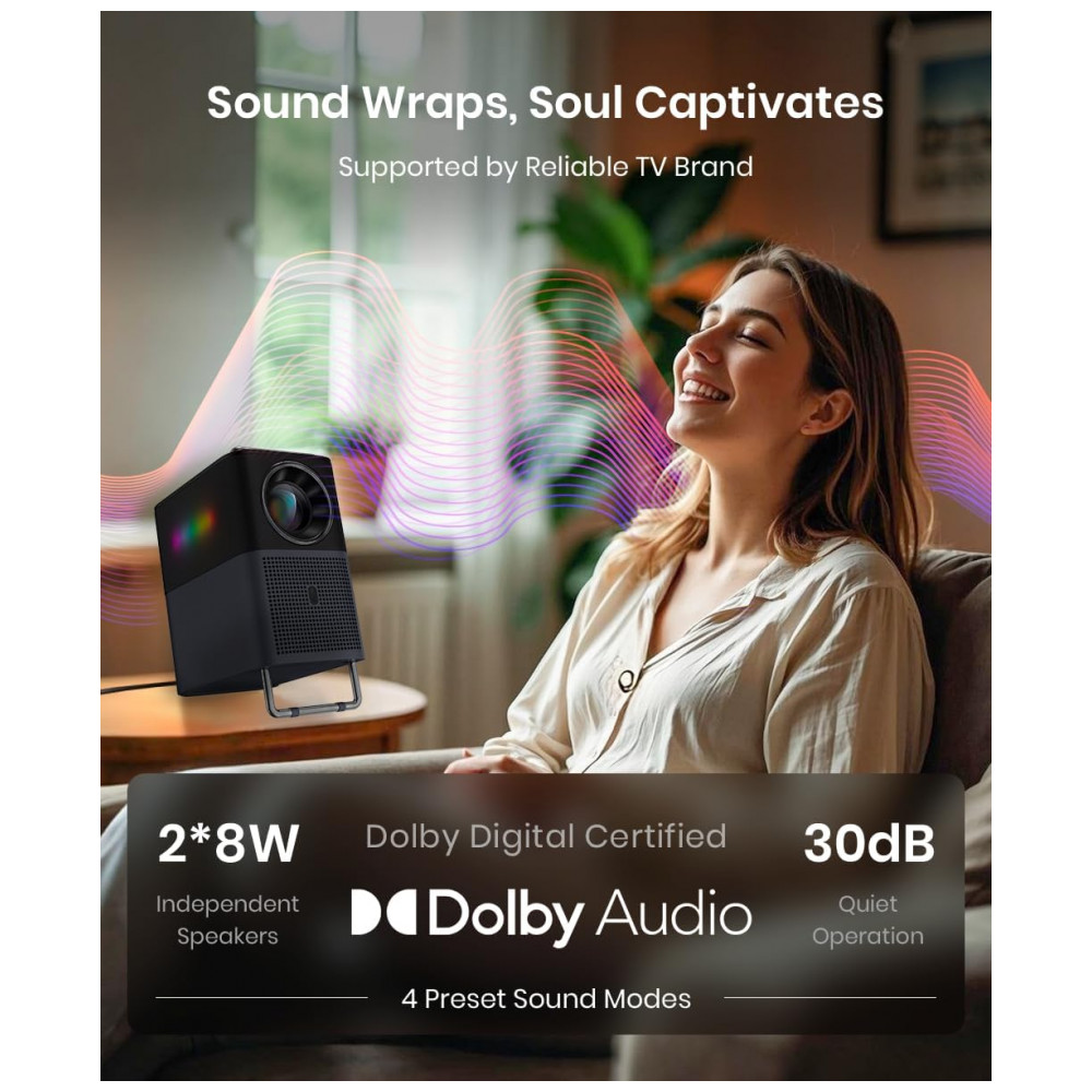 Possui ajuste automático de foco, nivelamento e correção de keystone para alinhamento instantâneo da imagem. Alto-falantes duplos 8W com Dolby Audio e Beat-Sync Lights que pulsam no ritmo da música, conectividade Bluetooth para caixas externas, WiFi, Chromecast e Google Assistant para controle por voz/toque.