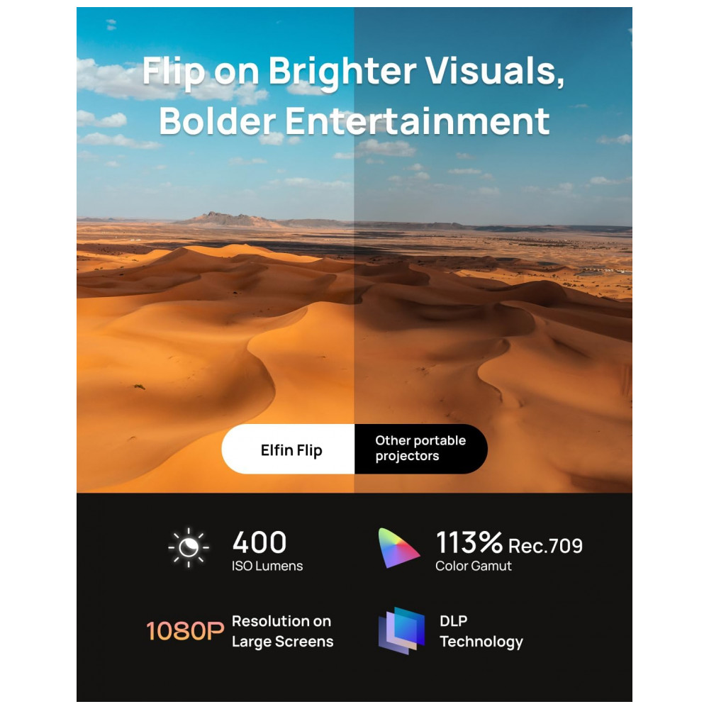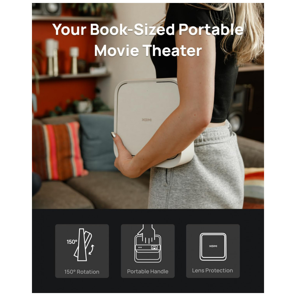 O projetor portátil XGIMI Elfin Flip é um projetor Full HD com resolução 1920 x 1080, indicado para uso em home cinema e projeções internas em ambientes residenciais. Com brilho de 400 lúmens ISO e cobertura de 113% da gama de cores Rec.709, oferece imagens nítidas e com boa reprodução de cores em telas de até cerca de 150″ em ambientes com controle parcial de luz.