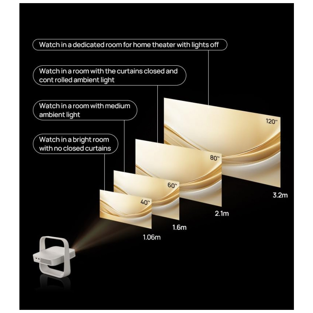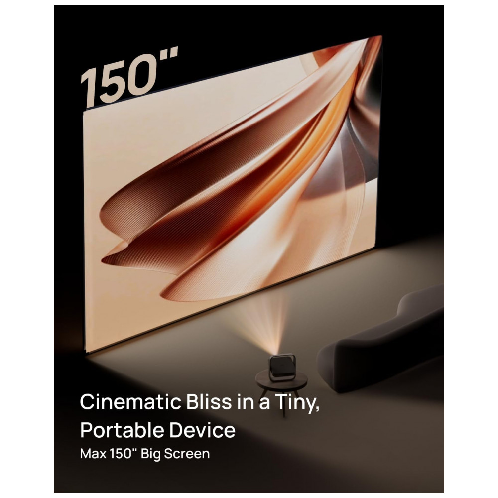 O equipamento conta com base ajustável integrada, permitindo ajustar o ângulo de projeção, inclusive para uso voltado ao teto, e proteger a lente quando o suporte é recolhido. A tecnologia Intelligent Screen Adaption inclui foco automático, correção automática de keystone, desvio inteligente de obstáculos e alinhamento automático de tela, simplificando a configuração da imagem ao ligar o projetor.