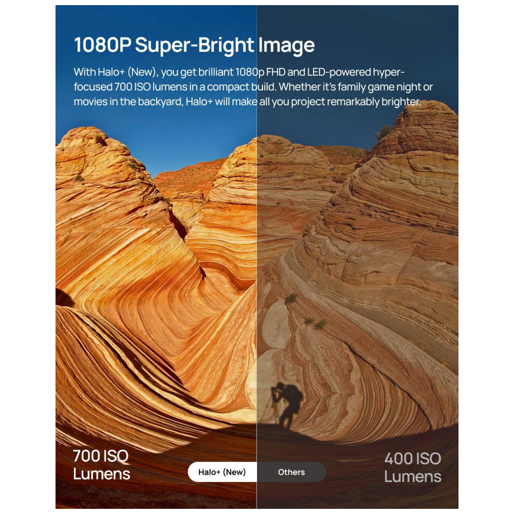 O projetor portátil XGIMI Halo+ GTV é um modelo Full HD com resolução 1920 x 1080 voltado para home cinema e uso multimídia em ambientes internos e externos, oferecendo brilho de 700 lúmens ISO. A fonte de luz LED e o sistema óptico ajustado permitem projeções em telas de grande diagonal com boa definição e nível de luminosidade adequado para sessões em ambientes com controle de luz.