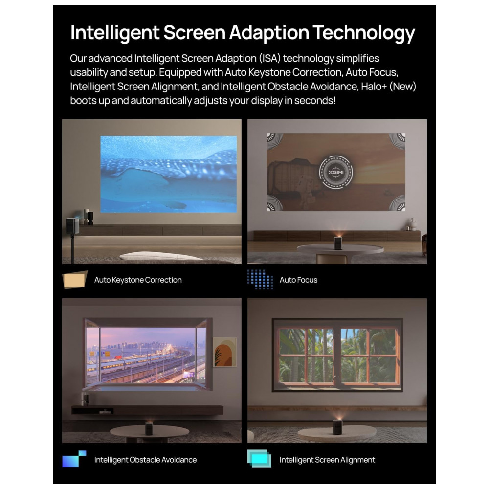O Halo+ GTV conta com bateria interna de 59,454 Wh, proporcionando até 2,5 horas de reprodução contínua em condições típicas de uso, o que permite utilizá‑lo em deslocamentos, viagens e ambientes sem tomada próxima. A tecnologia Intelligent Screen Adaption reúne foco automático, correção automática de keystone, alinhamento de tela e desvio automático de obstáculos, ajustando a imagem em poucos segundos ao ligar o projetor.