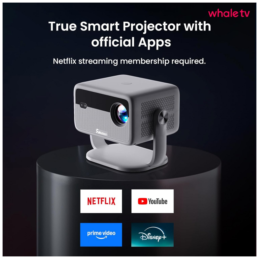 Equipado com sistema operacional Whale OS, suporta download de mais de 500 aplicativos diretamente da loja, incluindo Prime Video, YouTube e Hulu. Possui WiFi dual-band (2.4G+5G), Bluetooth bidirecional e alto-falantes 2x10W com equilíbrio de som por IA. Gera imagens de 102 cm a 381 cm em distâncias de 0,57 m a 5,68 m, com zoom de 50% a 100%.