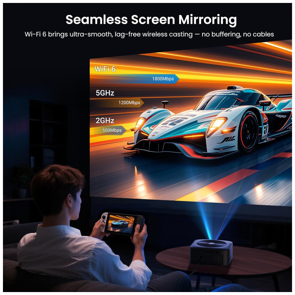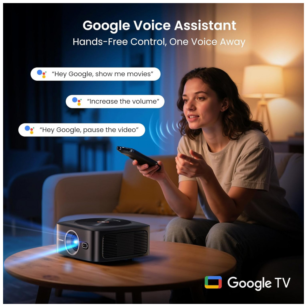 O Projetor Smart HAPPRUN J7 Pro é um projetor portátil com Google TV licenciado oficialmente, resolução nativa Full HD 1080P e suporte a entrada 4K, projetado para uso em home theater interno ou externo. Ele permite acesso direto a aplicativos como Netflix, Prime Video e YouTube, com assistente de voz Google integrado e espelhamento sem fio via WiFi 6 dual-band, compatível com smartphones, laptops, tablets e consoles de jogos.