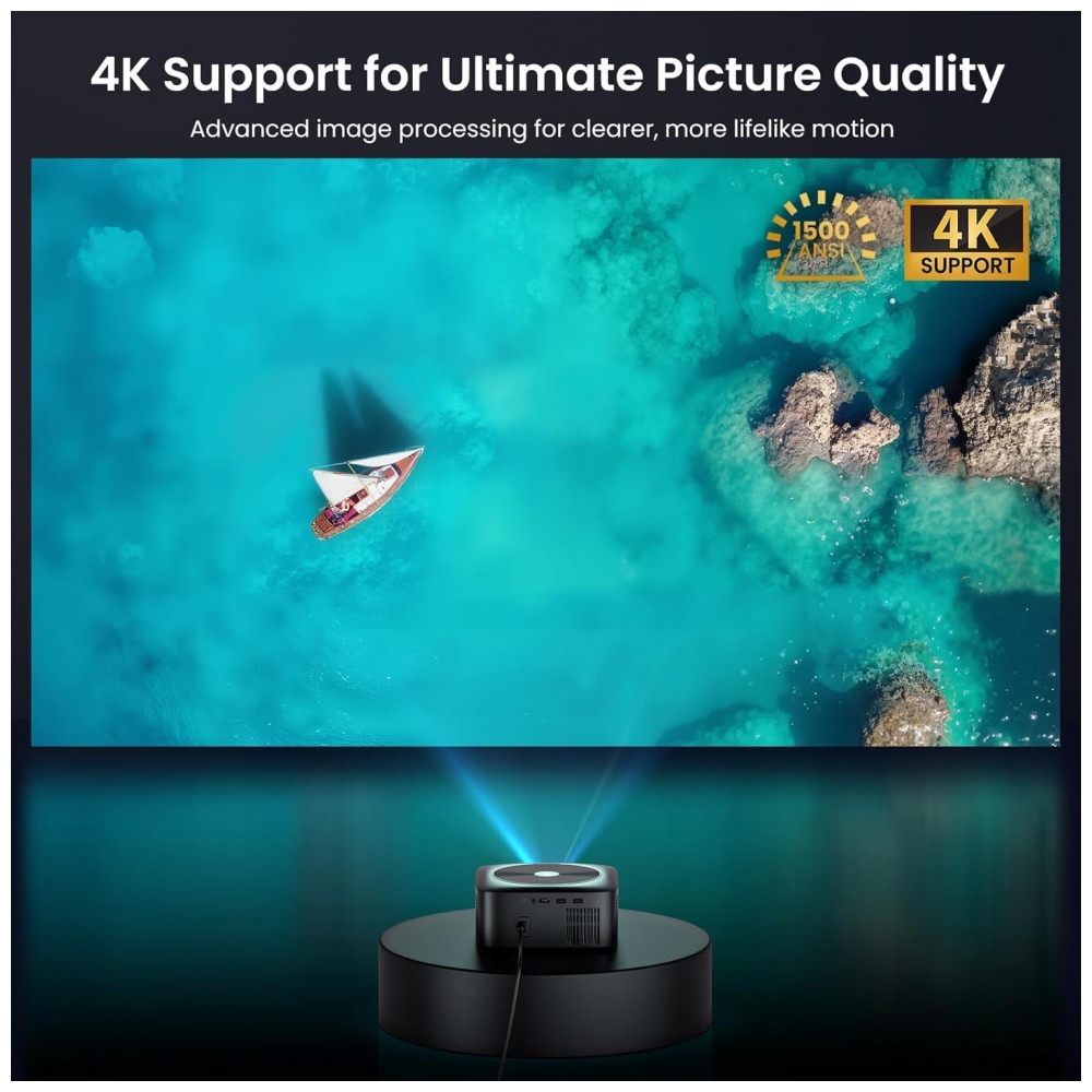 Equipado com brilho de 1500 ANSI lumens, contraste de 25.000:1 e HDR10+, oferece projeção de imagens de 76 cm a 508 cm em distâncias de 1,67 m a 6,71 m. Inclui foco automático, correção automática de keystone e alto-falantes duplos Hi-Fi com Dolby Audio para reprodução sonora.