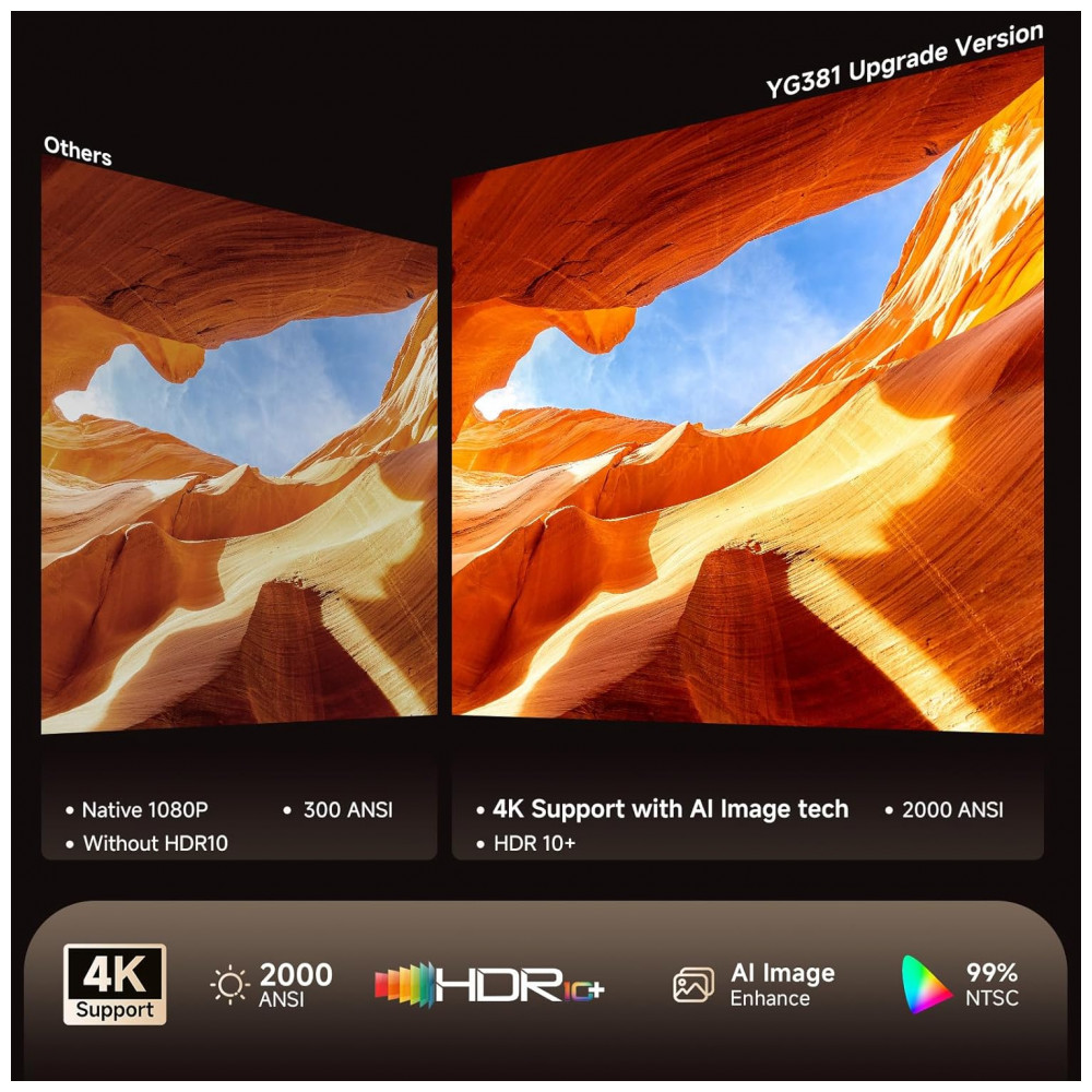 O Projetor Smart iSinbox YG381 é um projetor portátil com suporte a 4K e resolução nativa 1080P, equipado com sistema operacional Smart Pro OS e apps integrados como YouTube, Prime Video e Disney+. Ele possui suporte ajustável 360° para projeção em teto ou parede, com proporção de projeção 1.35:1, ideal para uso em home theater, camping externo ou apresentações.