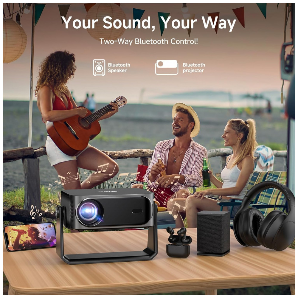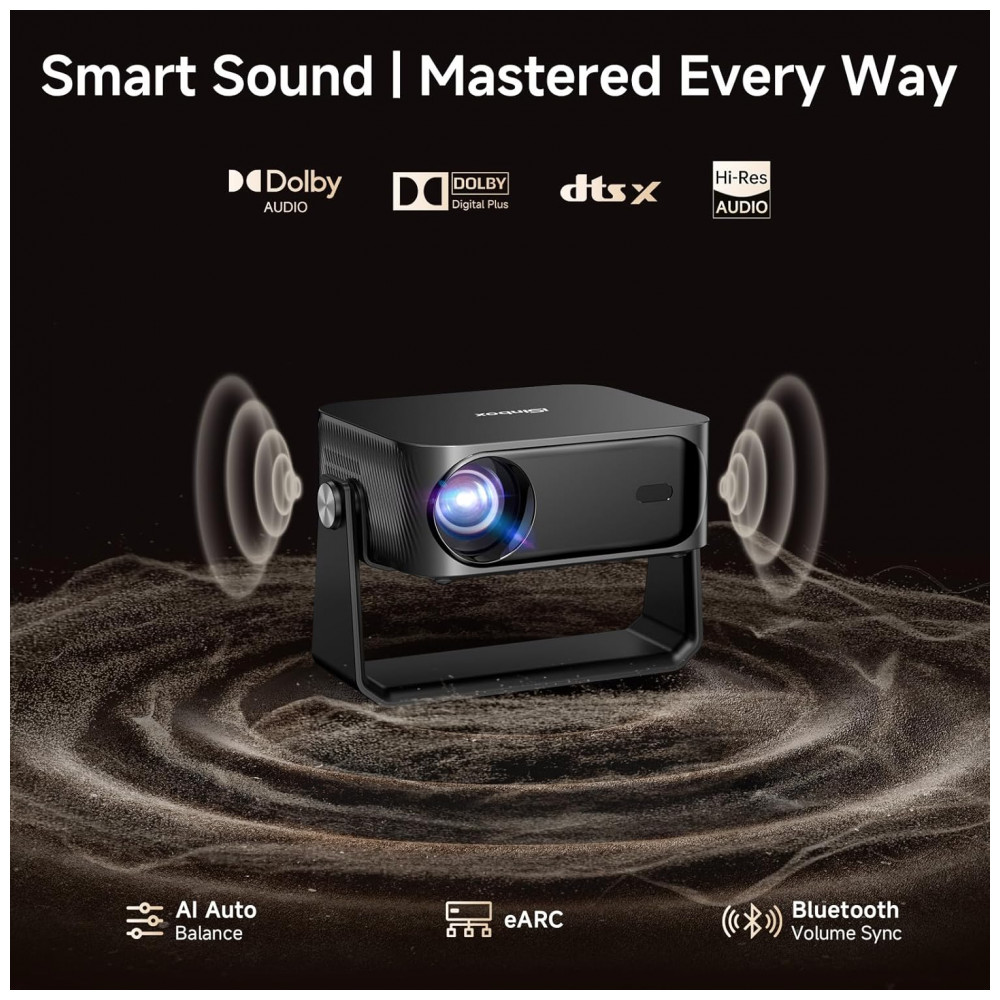 Os alto-falantes suportam Dolby Audio e decodificação DTS, com portas HDMI, USB e compatibilidade com laptops, PCs, smartphones, PS4/PS5 e TV sticks. A fonte de luz LED oferece vida útil de 100.000 horas, com montagem versátil em teto, tripé, mesa ou parede.