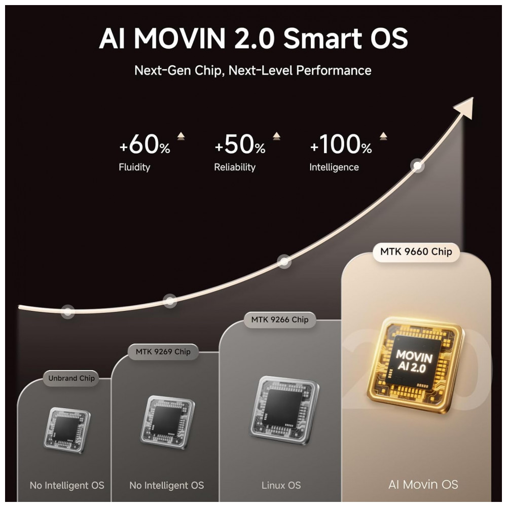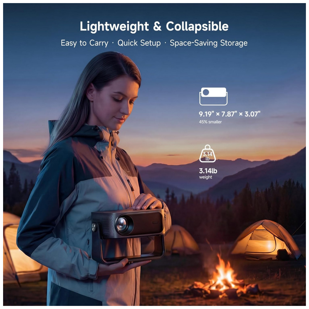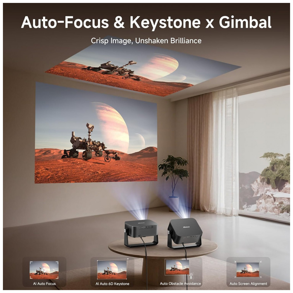 Com brilho de 2000 ANSI lumens e contraste de 25.000:1 com HDR10+, projeta imagens de 99 cm a 508 cm em distâncias de 1,22 m a 5,18 m. Inclui ajustes automáticos de foco, correção keystone 6D, alinhamento de tela e zoom digital de 50-100%, além de conectividade WiFi 6 e Bluetooth 5.3 bidirecional.